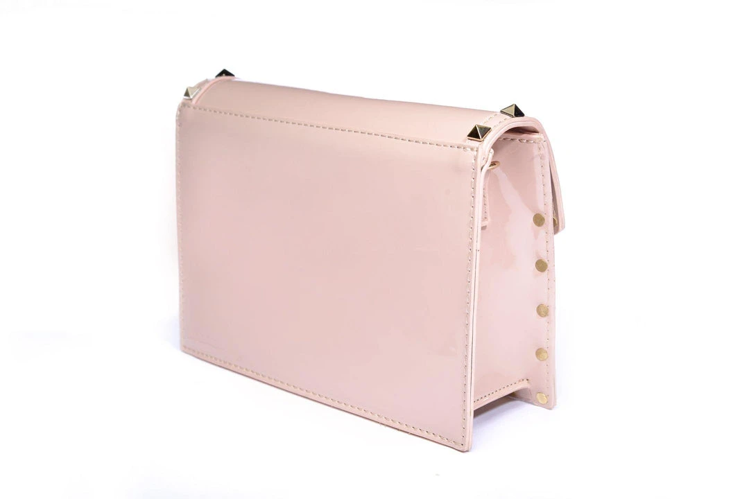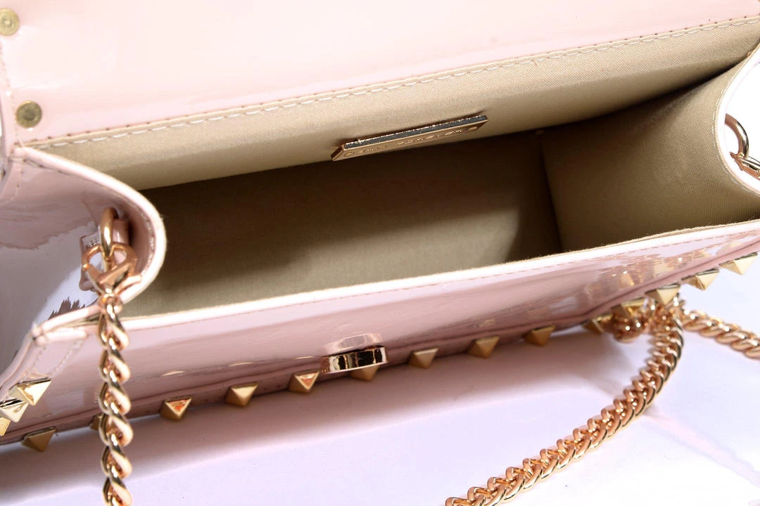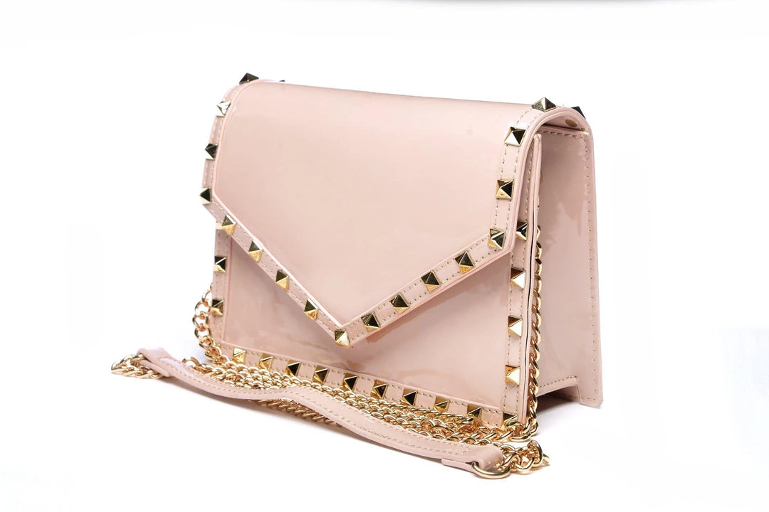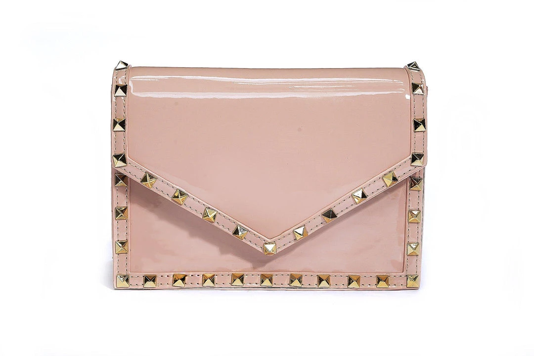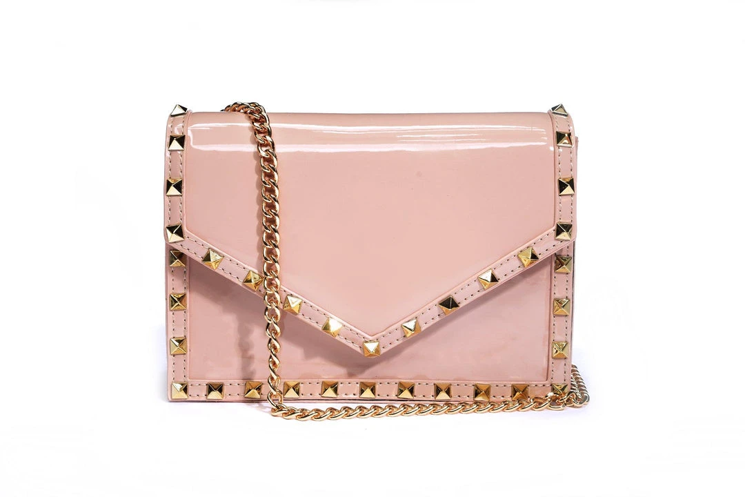 “Bold, badass, and beautiful,” things come in small packages just like this shiny, soft pink faux patent leather bag adorned with studs. A detachable chain makes it versatile for clutch or cross body-wear.