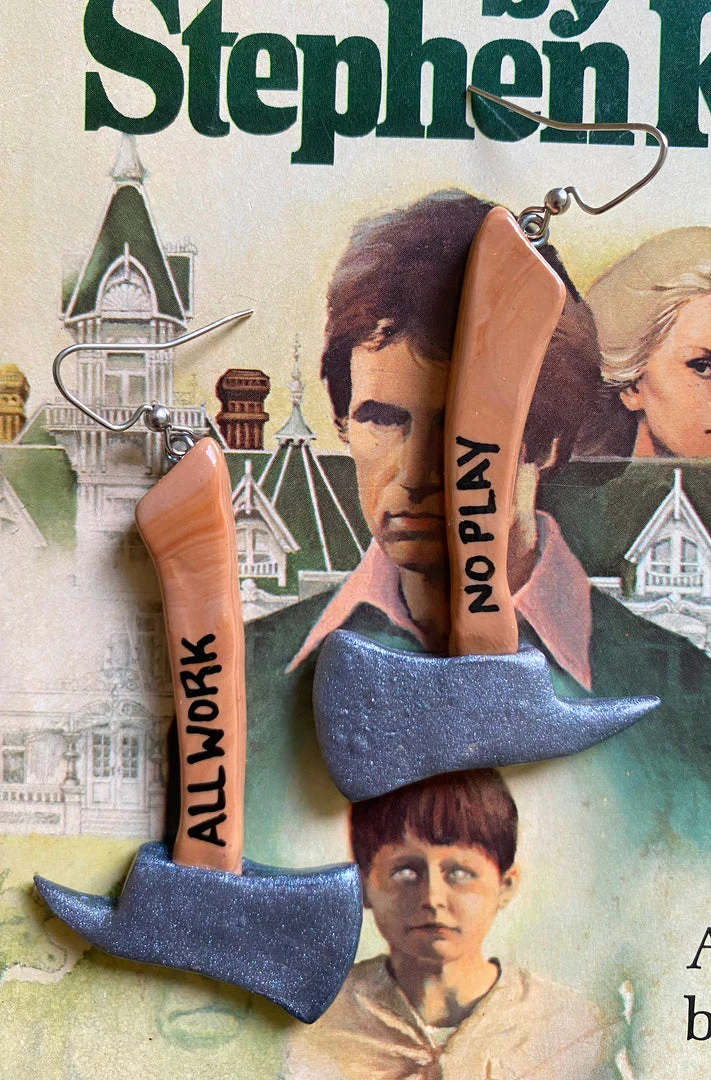 All Work! No play! These spooky good earrings are a must have for the horror lover. Handmade in the USA. Lightweight and created with consciously sourced materials.