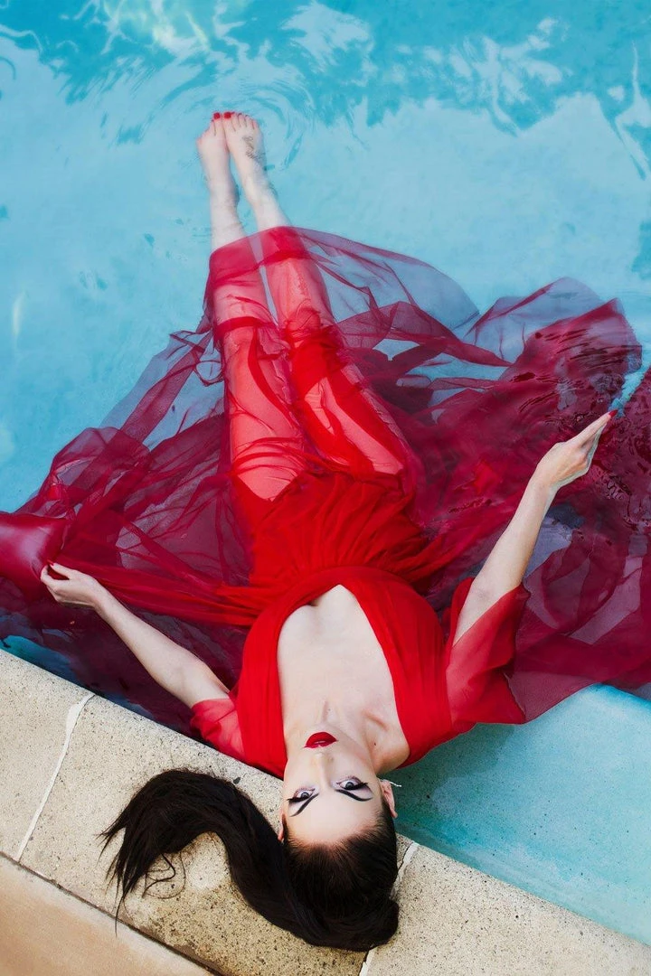 Featuring cascades of blood red tulle, this dark and very sexy maxi features a deep-v plunge neckline and floor length, sheer sleeves. With a split front and a lush billowy skirt with two splits up the front that go from floor to waist, you’re a dangerously sexy vision of gothic glamour.
