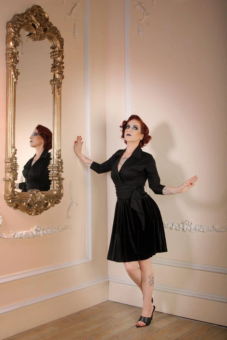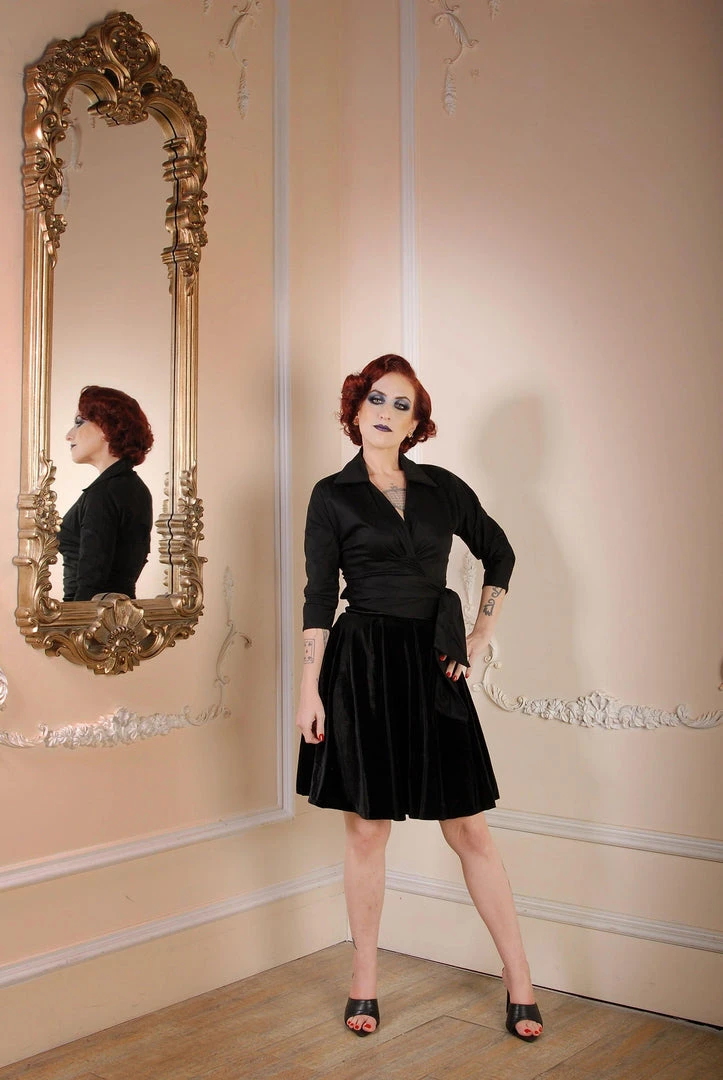This classic Wrap Top is perfect addition for your entire wardrobe, the folded collar and crossover wrap front has a sophisticated look, while three-quarter sleeves are well suited for colder weather outings. The wrap around hem is a chic way to show off your curves and ensures a perfect fit. Made in delectable, easy wearing black sateen, you’ll look fashionable and feel wonderful whenever you wear this wrap top.