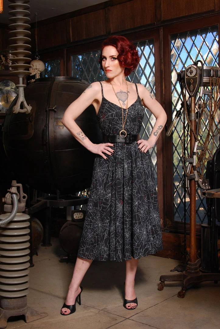 Featuring a 70’s inspired, fitted “ballerina” style bodice, adjustable spaghetti straps, and a gathered full skirt with deep pockets. Fully lined, with a back zip. Perfect for summer with its flowy poly/spandex crepe material.