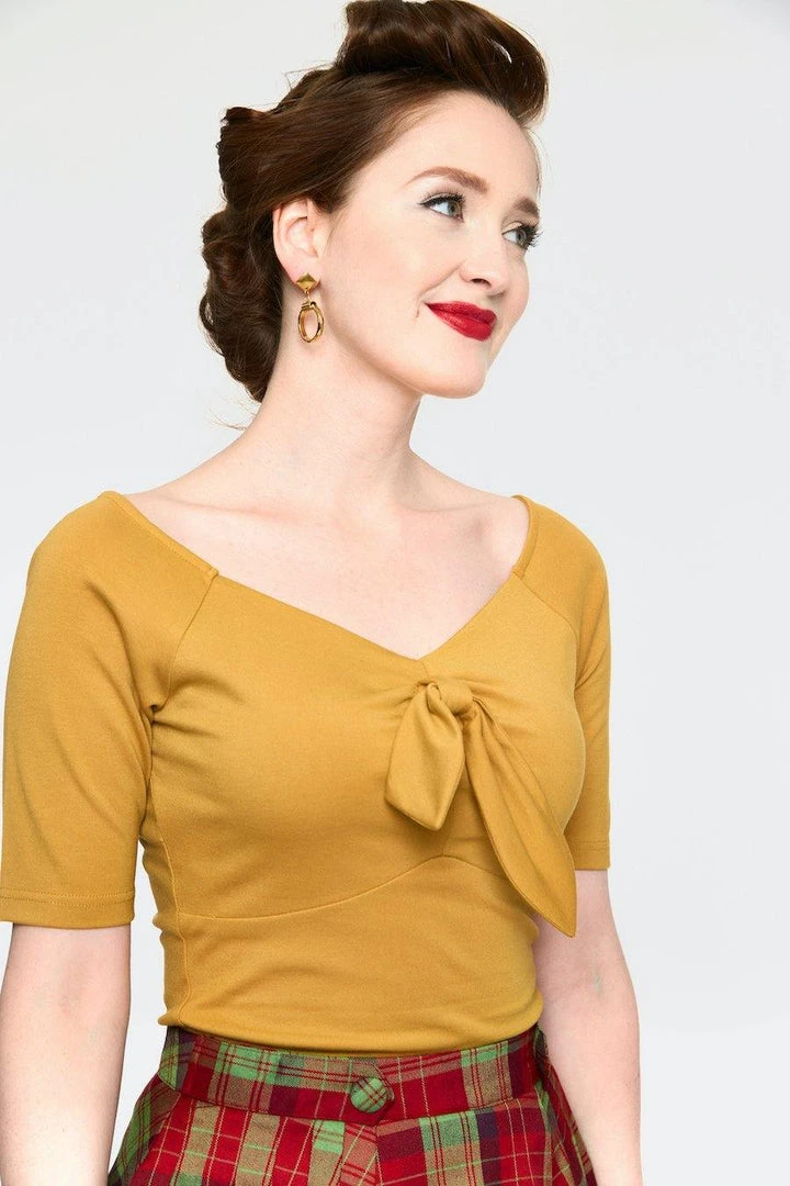 Basic knit soft to touch mustard blouse with V-neck and long tied bow on the front.