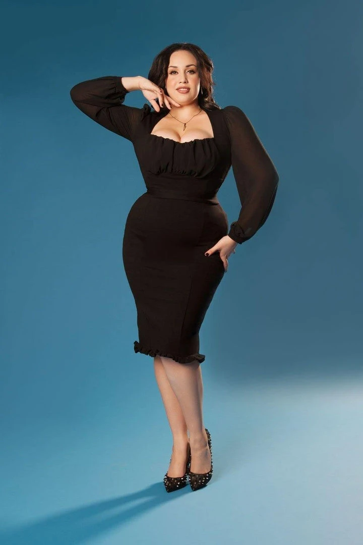 As supernaturally stunning as the muse who inspired this dress, the Aziza Dress will bring benevolent fashion magic to your vintage inspired wardrobe. Chiffon sleeves lend ethereal allure to this darkly romantic wiggle dress, which also features a gathered chiffon bodice for a flirt of cleavage and skirt hem highlighted by a ruffled chiffon embellishment. This combination of ponte and chiffon offers a fitted silhouette that looks positively decadent in this very vintage, very vamp-inspired dress. The Aziza dress is finished off with a back zip and double kick pleat to make wiggling in and out of it an easy process.