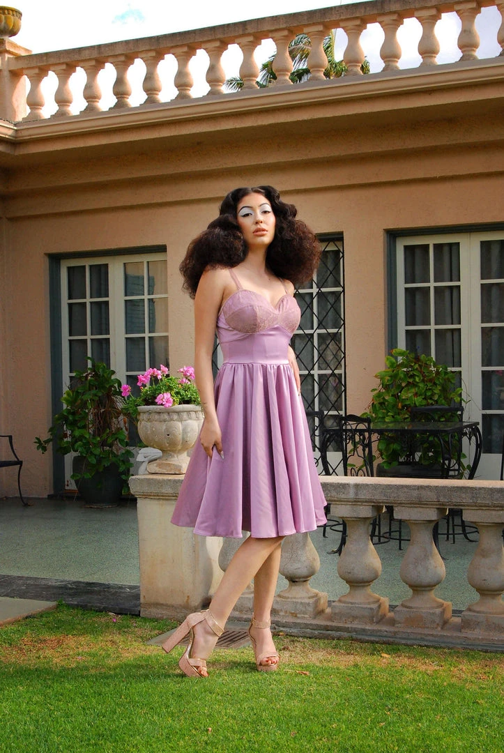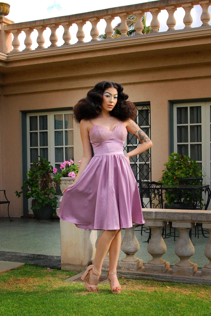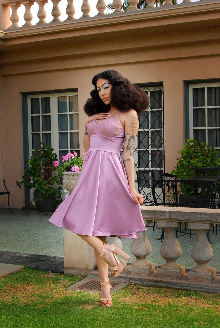 The Courtney dress features a full skirt, deep pockets, and a lingerie inspired, lace covered bodice, with piping and adjustable shoulder straps made from stretch velvet. Made from the highest quality stretch satin. Plays well with the Gilded Lily All-Over Rhinestone Platform Heels in Rose Gold.