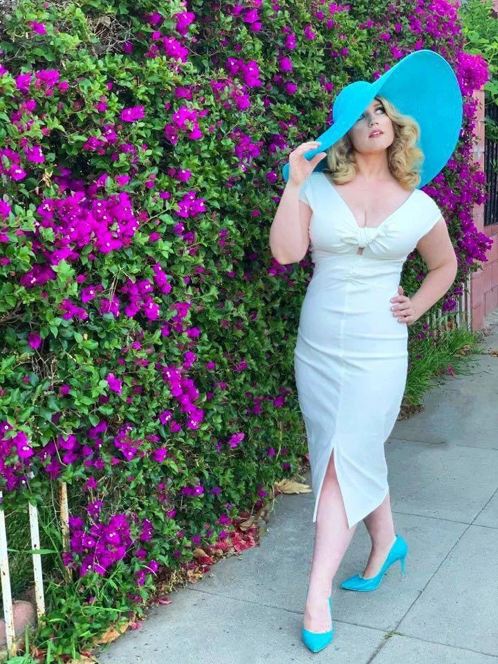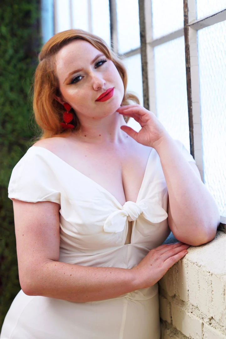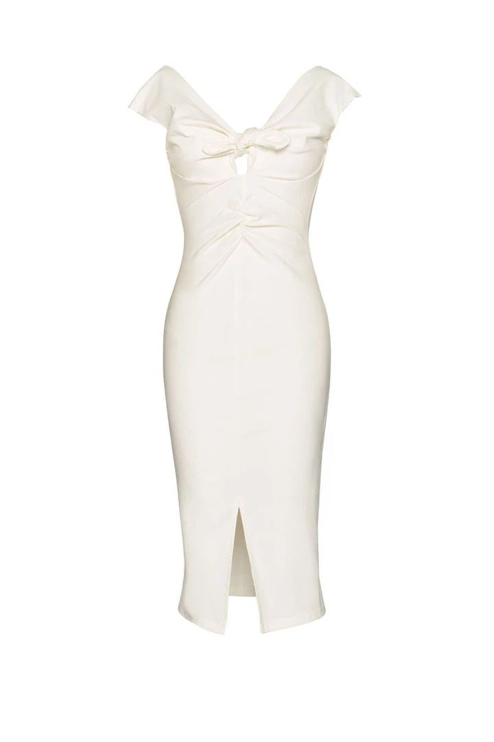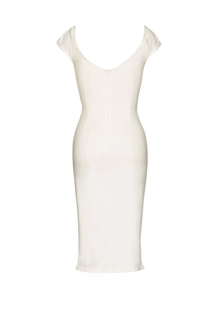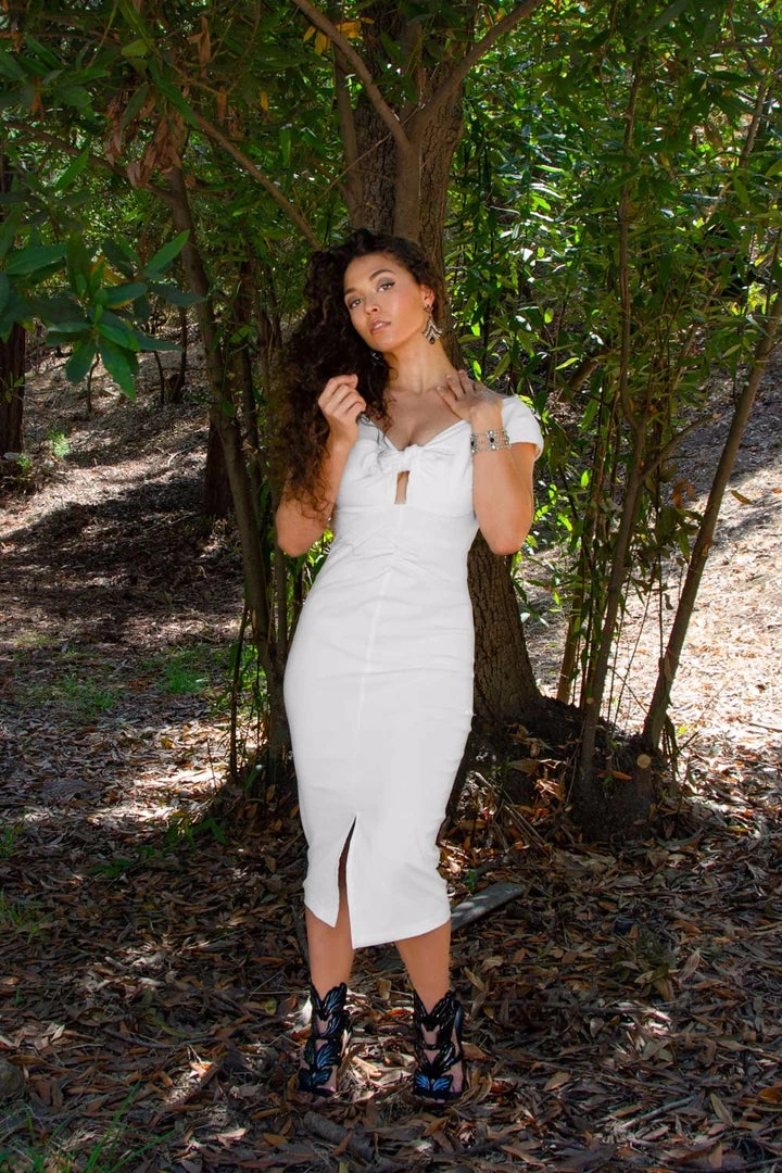 The Niagara Dress in white Stretch Bengaline – This is the ultimate sex kitten dress. The Niagara Dress is made from a high quality, soft stretch, snowy white bengaline that feels wonderful and hugs your curves perfectly. Featuring an almost off-the-shoulder neckline with cap sleeves that sit just on the top of your arms for a sexy flash of flesh and a tie front detail with a sassy, eye catching cut out. Niagara has a fitted silhouette and a gathered detail down the center front of the dress that gives way to a very sexy front slit.