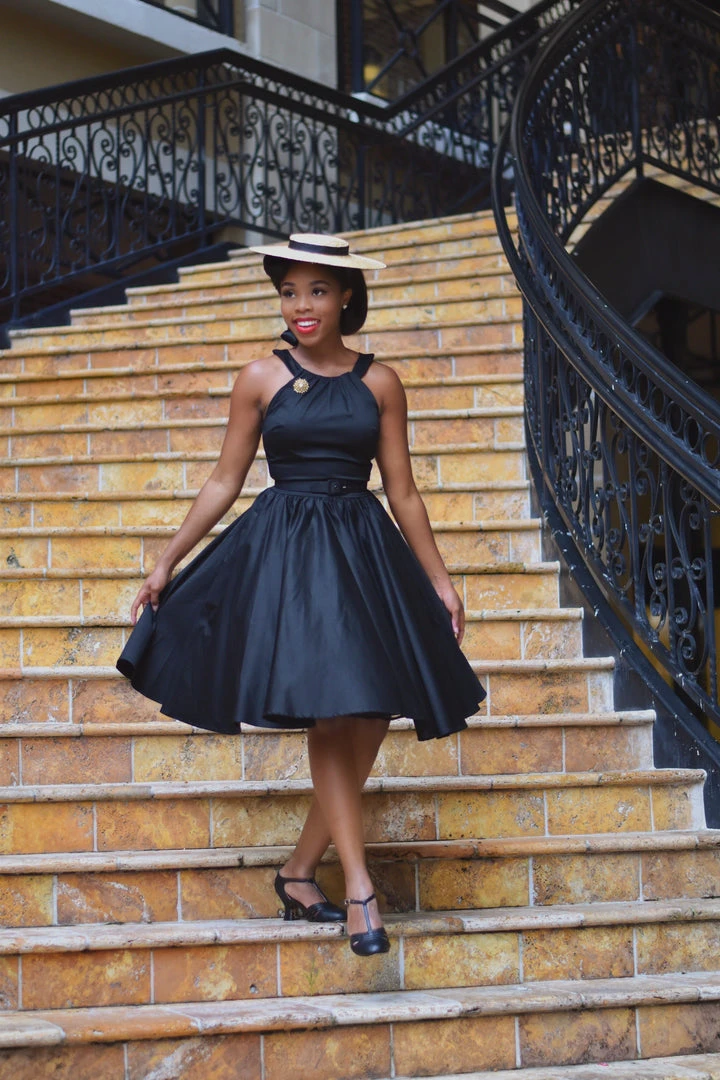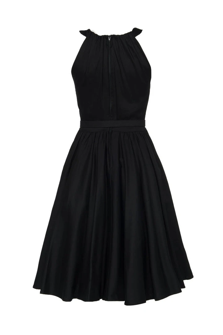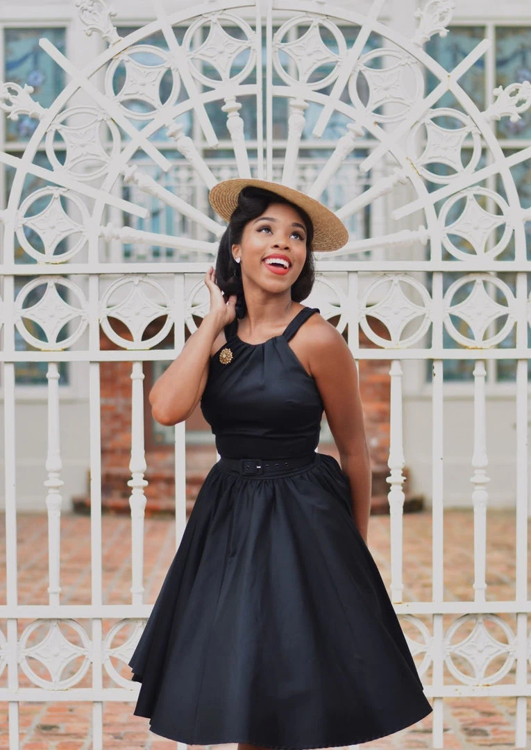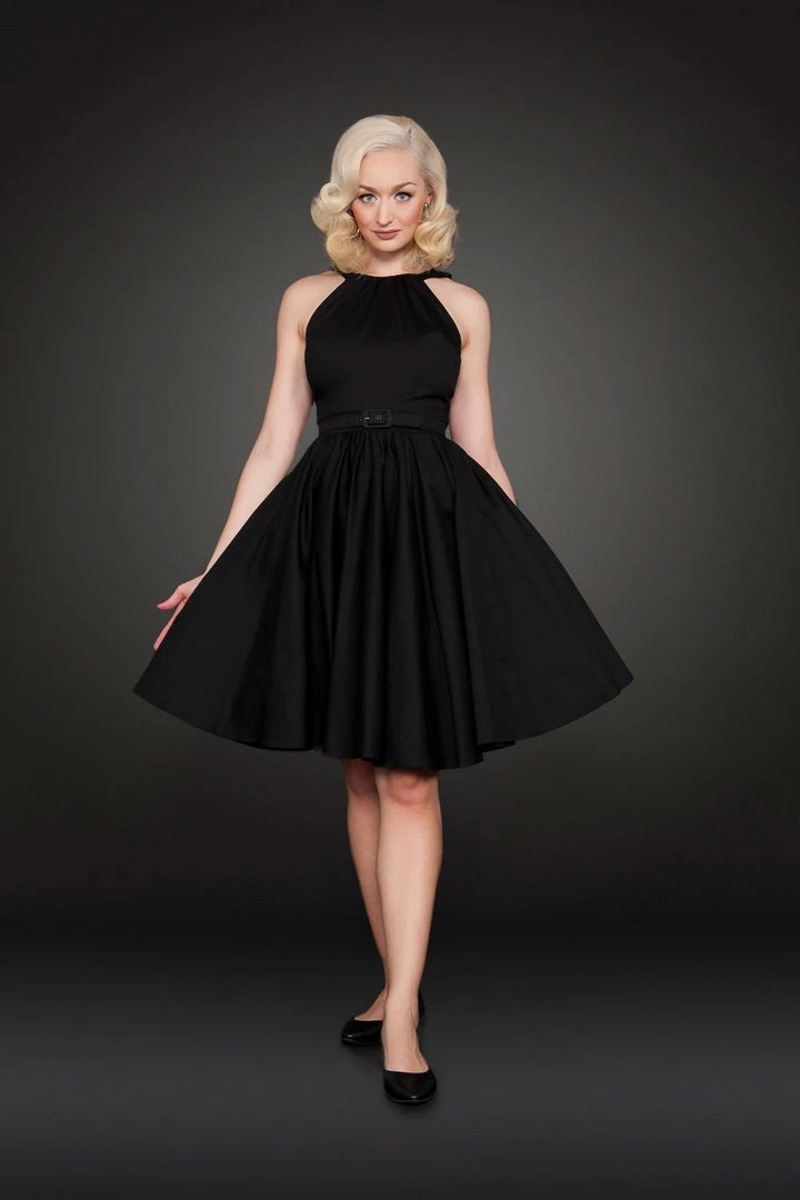 Stand out from the crowd in this fantastic sundress – designed to be both modest for the office and chic for your days off! The Harley Swing Dress has darting at the bust, with a nipped in waist and a full gathered skirt that measures at 25 inches long. Featuring a gathered neckline, a zipper in the back that goes from nape to waist, and pockets in the side seams, this dress is a cheeky way to show off your silhouette. Take it for a swing, matching grommet belt included, and don’t forget your Longline Bra – we recommend going strapless for this one.