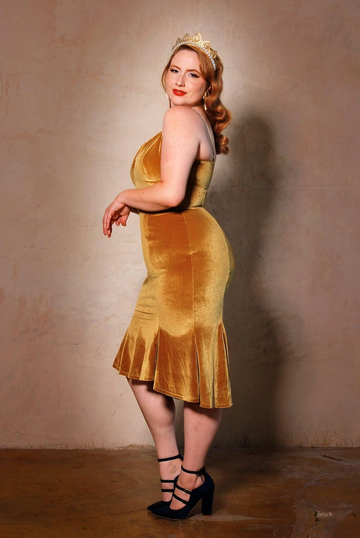 Our figure-flattering Venus Slip now in a versatile Midi. This gorgeous 1930’s inspired slip dress is made from the softest stretch velvet in gold and features a fitted silhouette, thin shoulder straps, a plunge bodice, fish tail hem, and back zip.