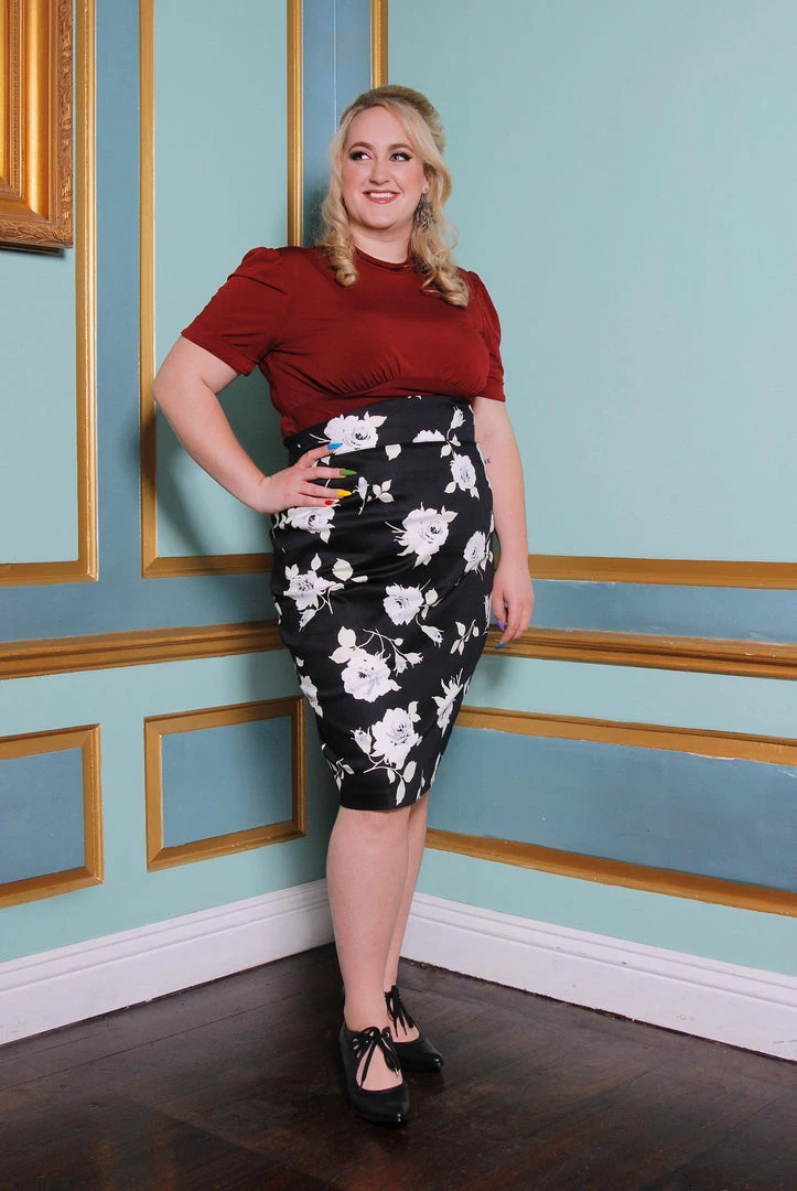 Feel victorious in this gorgeous, solid stretch merlot high-necked blouse. The Victoria Top features a quarter-length, slightly puffed sleeves with scalloped edges, and a fitted and gathered bodice with a scalloped hem. Of course, an added back zip for ease of slipping on. Featuring a high quality, soft nylon/spandex blend fabric.