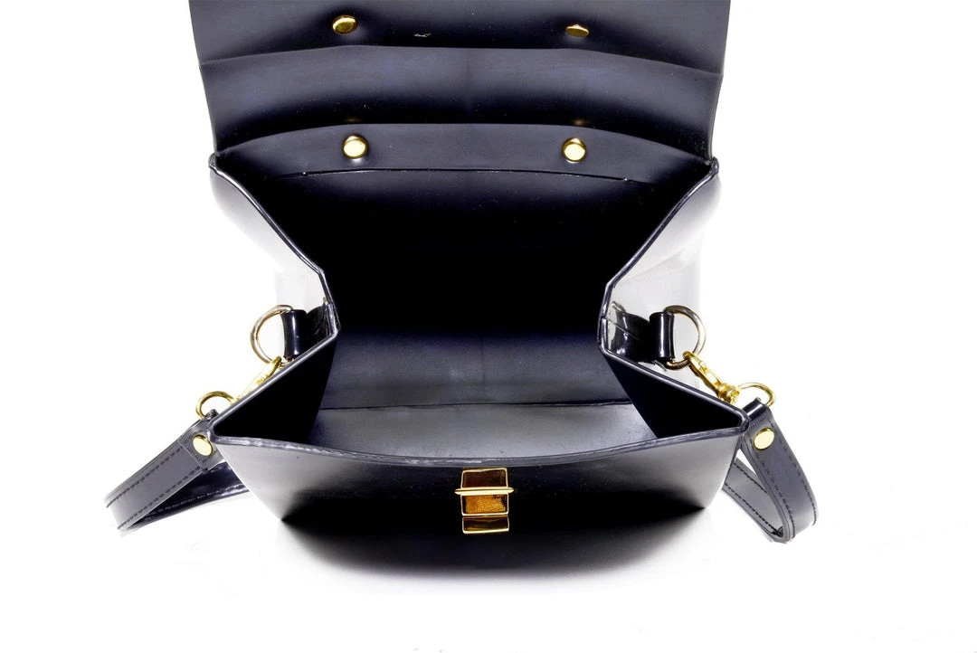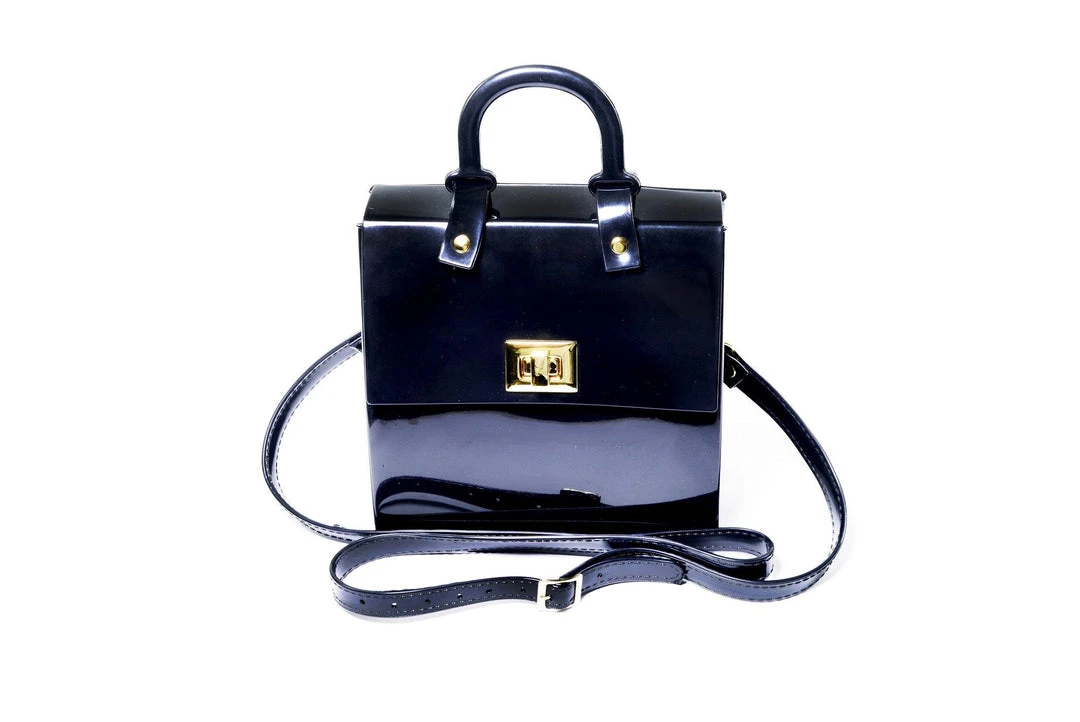 Square glossy black jelly bag, can be carried by the handles or with an adjustable detachable shoulder strap.