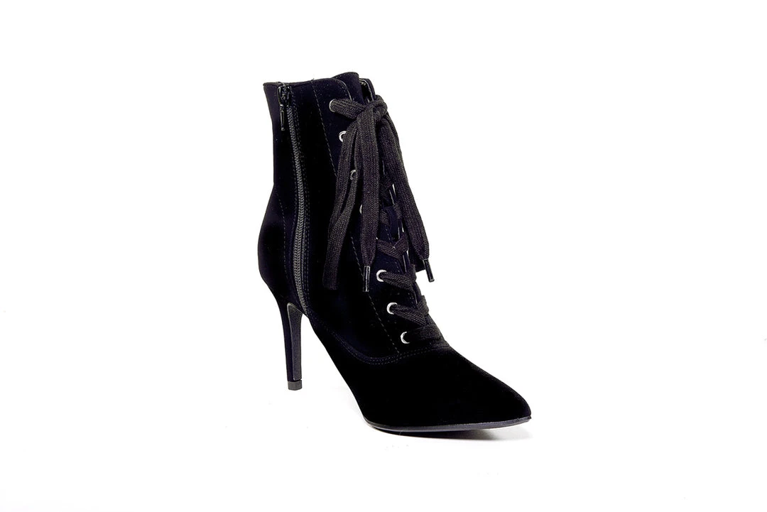 Joia What’s New, Pussycat? Scorpio Stiletto Lace Up Hiker Bootie Heels In Midnight Black Faux Suede