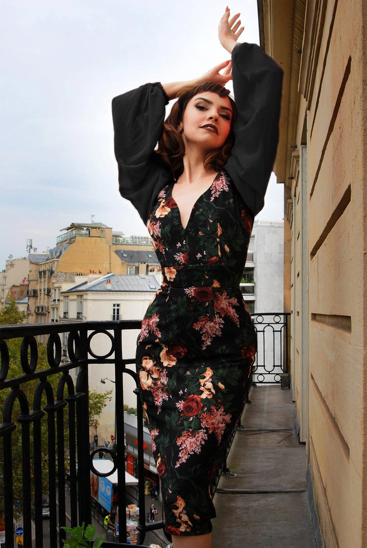 The Clara combines old world elegance with modern comfort. Made from the highest quality stretch poly/spandex crepe, with a devilishly deep neckline, banded waist, and soft black chiffon sleeves.