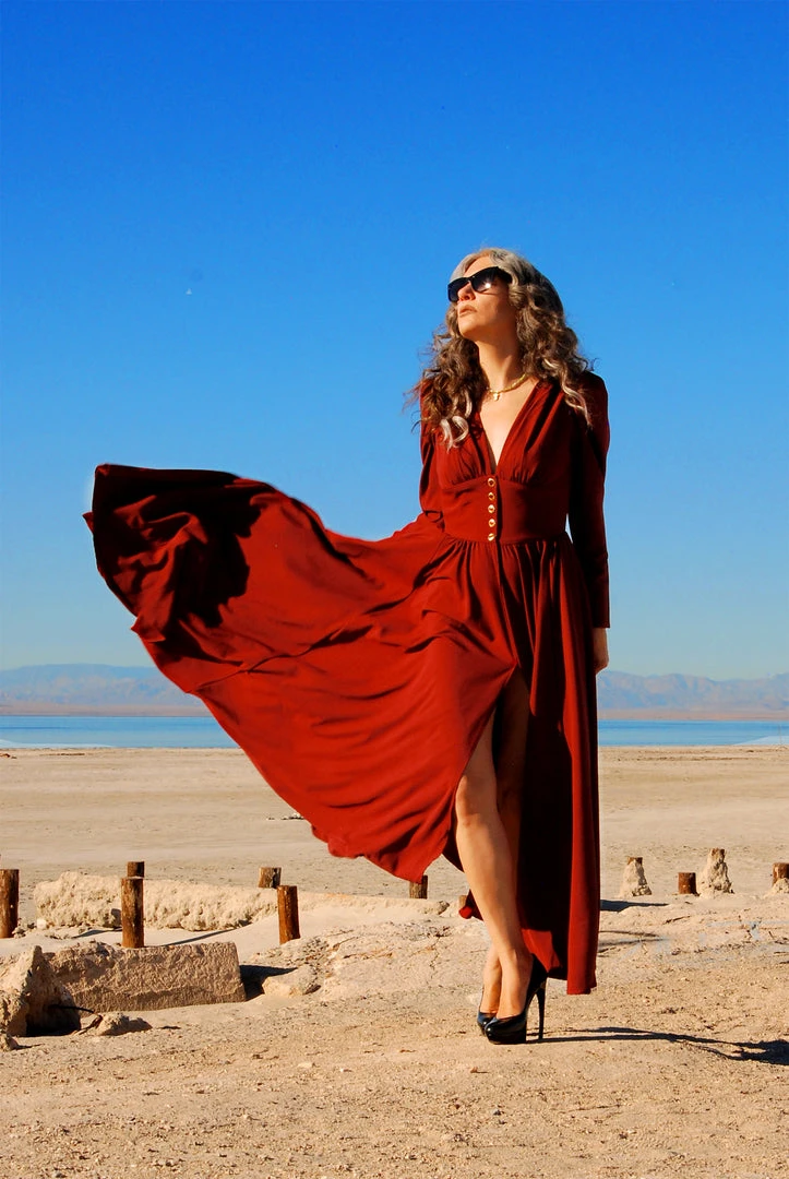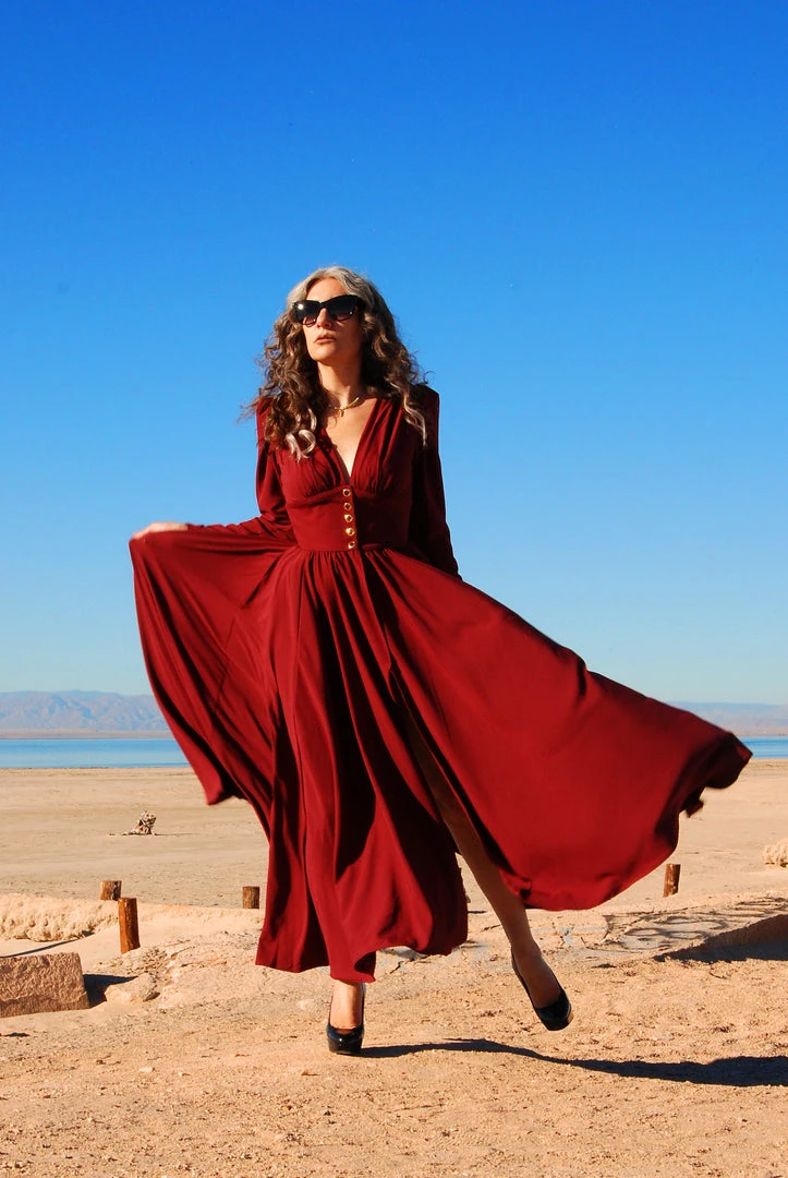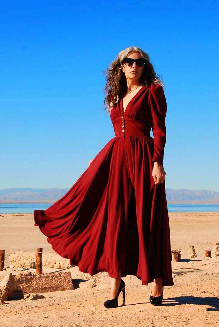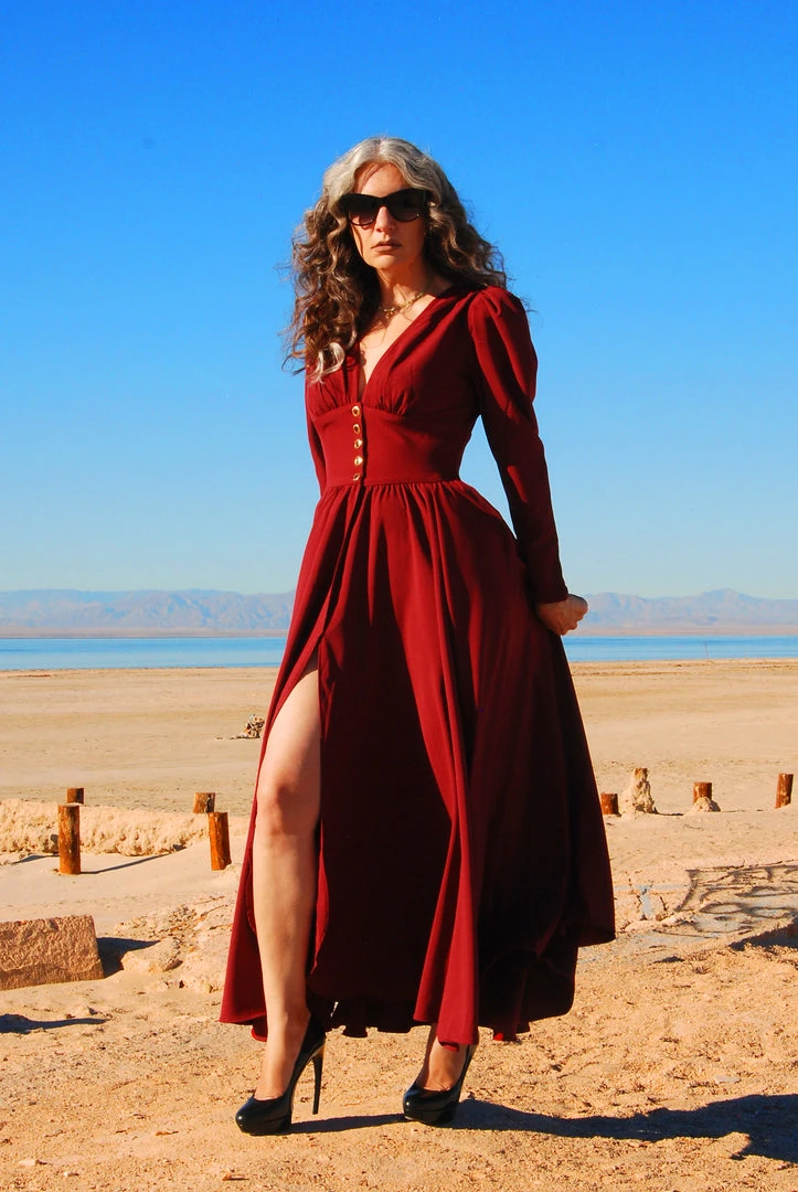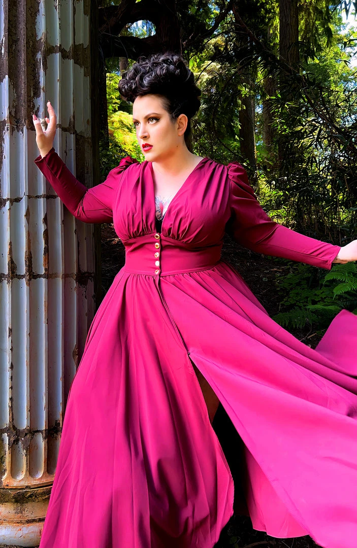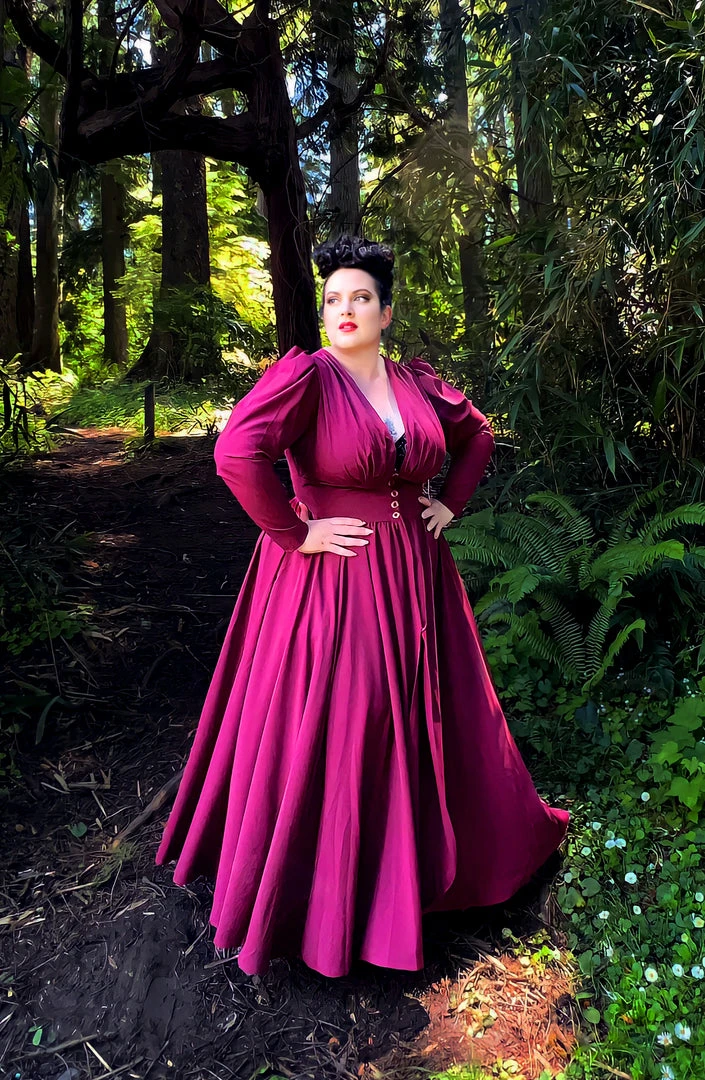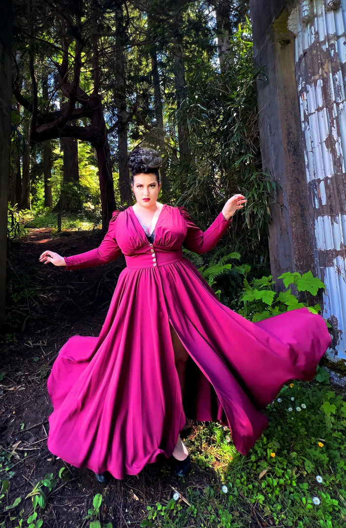 Inspired by the classic vintage coat dress, the Clarice combines elegance with versatility. Made from our light and breathable poly/spandex crepe, this dress can be worn year ’round. With a buttoned waist, plunging neckline, and full sweeping skirt containing deep pockets, the Clarice can be worn over any number of outfits to suit your personal style, or simply worn on its own using the hidden hook in the skirt to close for modesty.