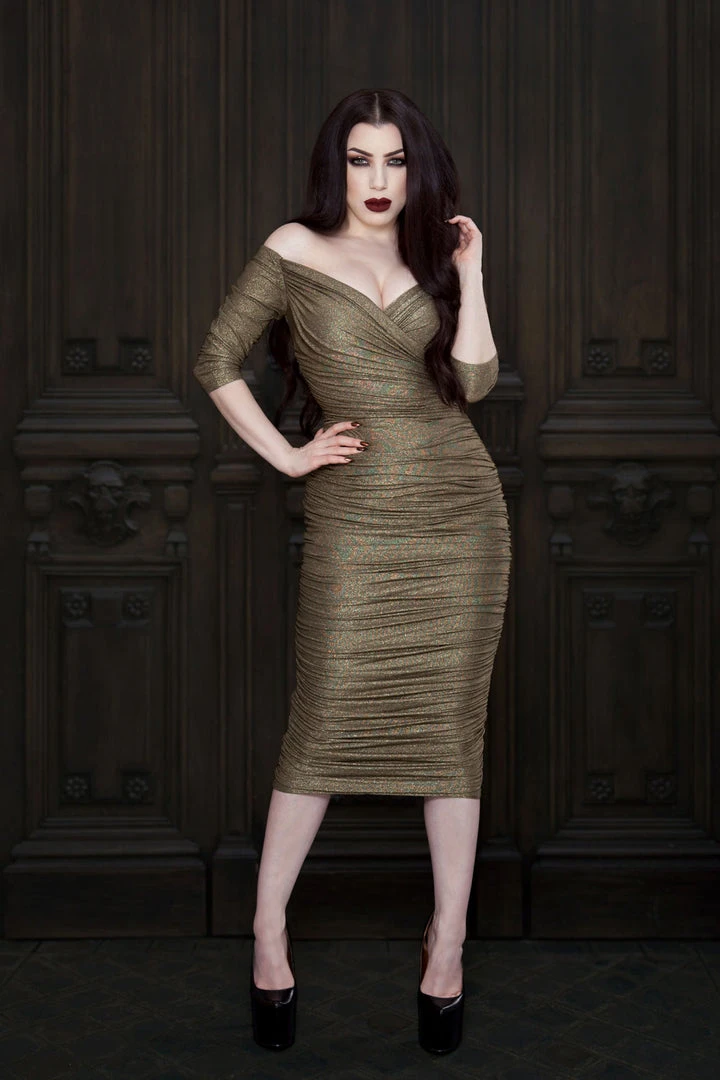 One of the most glamorous dresses we’ve ever made, the Monica in Lurex Jersey is an absolute wonder. With a design inspired by the sexy gathered wiggle dresses of mid-century Hollywood, the beautiful crossover bustline features soft, clear elastic to hold the jersey to your skin and allows the sleeves to sit slightly off-shoulder – and may also be worn comfortably on-shoulder. The fabric is a unique matte knit that will not pill, resists wrinkles, and has beautiful drape and stretch. A built-in stretch Bengaline shaper for the bust, waist, and lower hip gives support, structure, and holds you in, while being surprisingly comfortable, while the gathered outer fabric disguises the internal structure and gives you a sleek and clean hourglass silhouette. The result is an incredibly sexy and attention grabbing wiggle dress with the structure to have you looking your best while stopping traffic and breaking hearts.