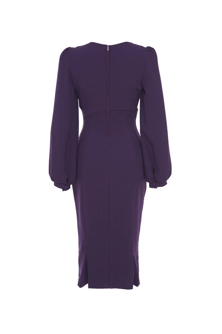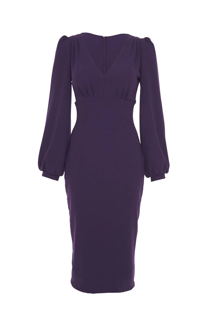 Sophisticated, elegant and sexy. Rachel is the latest dress from Traci Lords Couture for Every Body collection and is a stunning piece of artistic fashion. Made with vintage-style pebble crepe fabric, this design features full length billowy sleeves with a button closure cuff, a darling V-neckline accentuated by gathers under the bust, and a curve hugging silhouette with seaming running from the base of the bust down to the hem. Lined in the bodice and skirt in comfortable knit fabric, this chic purple crepe dress is carefully constructed to last a lifetime and has a enough stretch to hold on to your curves yet retain its shape no matter how many times you wear it! Finished off with a back zip, this timeless dress will have heads turning whether at the office or at the lounge.