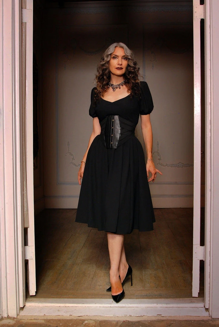 Featuring a renaissance inspired silhouette with a deep sweetheart neckline and puff sleeves, and a gathered circle skirt with deep pockets. Made from the highest quality 95% poly 5% spandex stretch crepe. Fully lined, with a back zip.