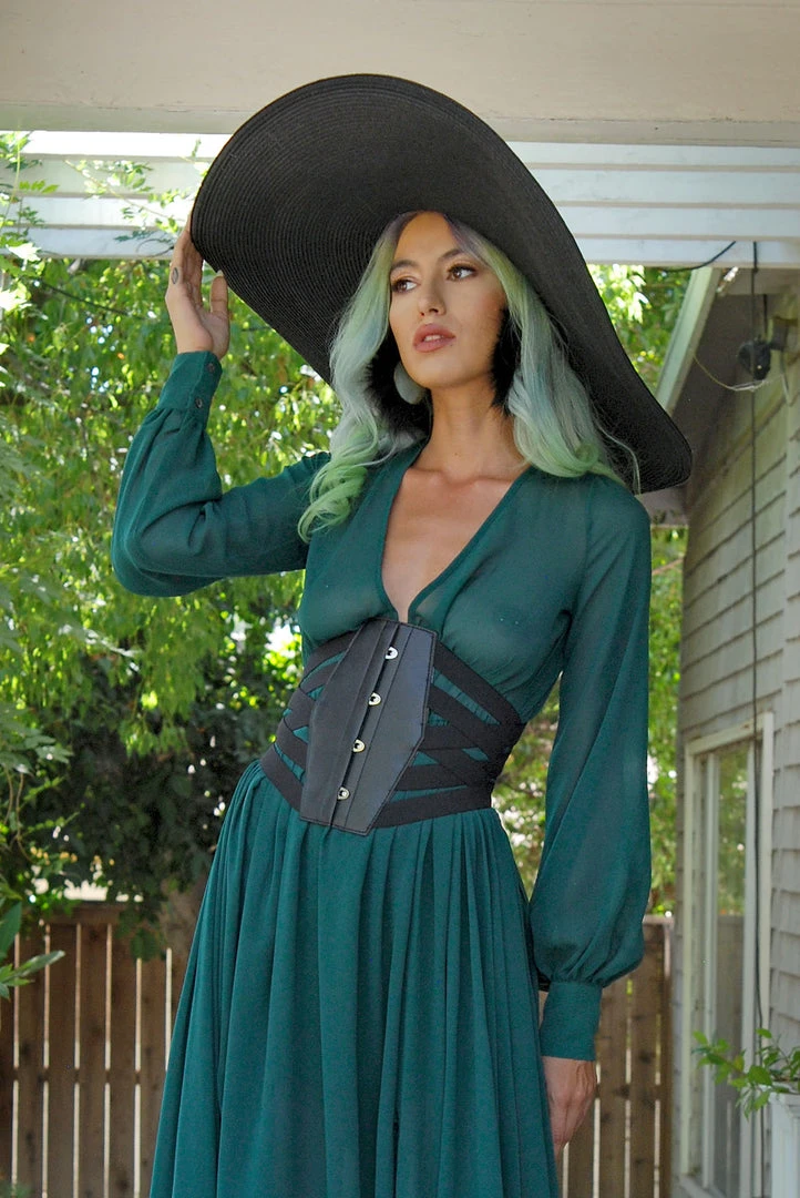 A vegan leather update to a favorite piece from Laura’s corset belt collection, this fantastic design features crisscrossed elastic that creates an extreme cinch to the waist while remaining completely comfortable, and allowing a full range of movement. Front closes with a steel-boned 4-hook busk, and back is fully laced to adjust to a range of sizes and desired amount of compression.
