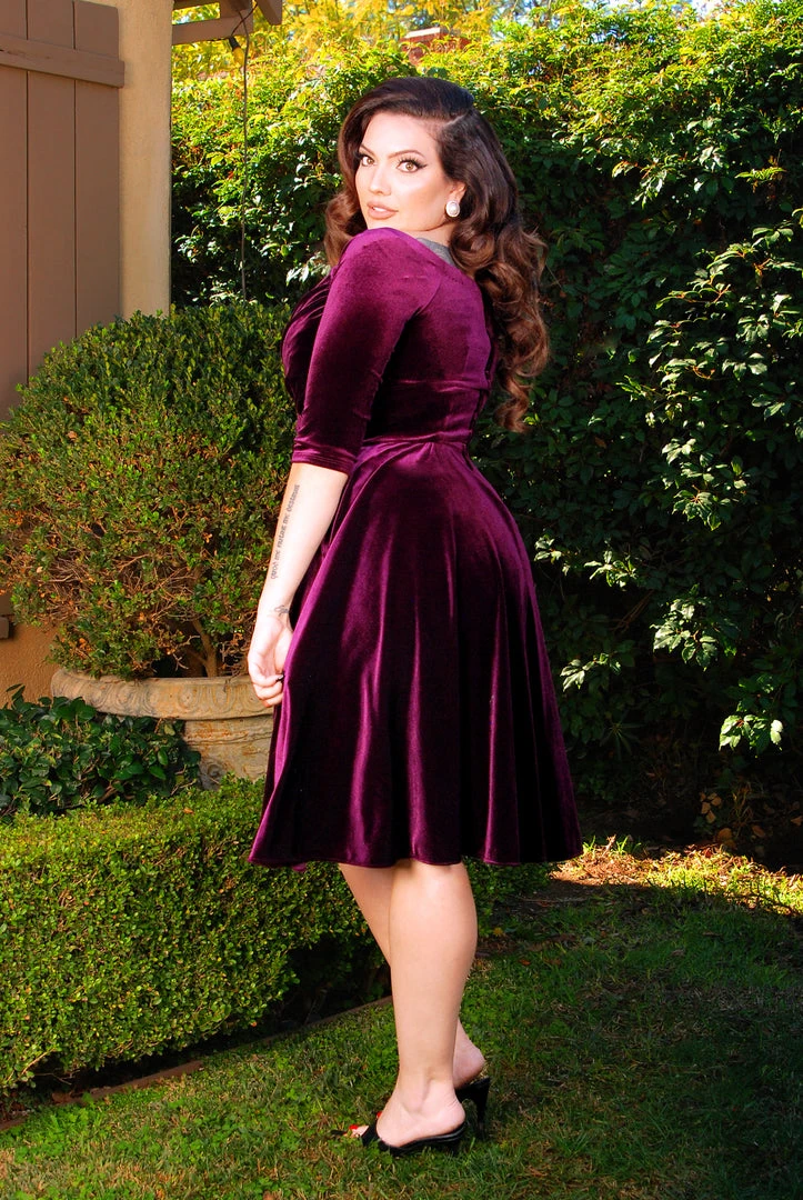 Inspired by our best-selling Monica wiggle, her sister is a swinging good time in the most sumptuous velvet you ever did see. The beautiful crossover bustline features soft, clear elastic that allows the sleeves to sit slightly off-shoulder for ultimate romance, but may also be worn comfortably on-shoulder. The Monica Swing includes our signature built-in stretch Bengaline shaper at the bust for support and structure while the gathered, faux wrap skirt flutters effortlessly. The result is a sweet but sexy swing dress that will have you turning heads all through the holidays.