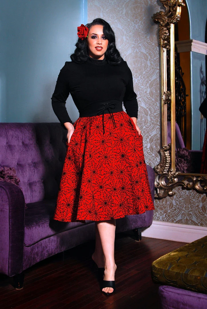 This gorgeous vintage inspired Corset skirt features a waist defining, contrasting waistband with a tie detail, and pockets that are deep enough to carry all your tricks and treats, as well as your lipstick and a mirror. The full sweep of the skirt is perfect for twirling on thru the cemetery or being fluffed up via the exclusive Laura Byrnes California Canvas Underskirt. Dress it up with a Peasant Top for work, or pair with our Morgana Jacket in Black Twill for maximum drama. Made from the highest quality stretch cotton sateen, in a beautifully spooky red & black flocked spider web print, this skirt will quickly become one of your fashion favorites.