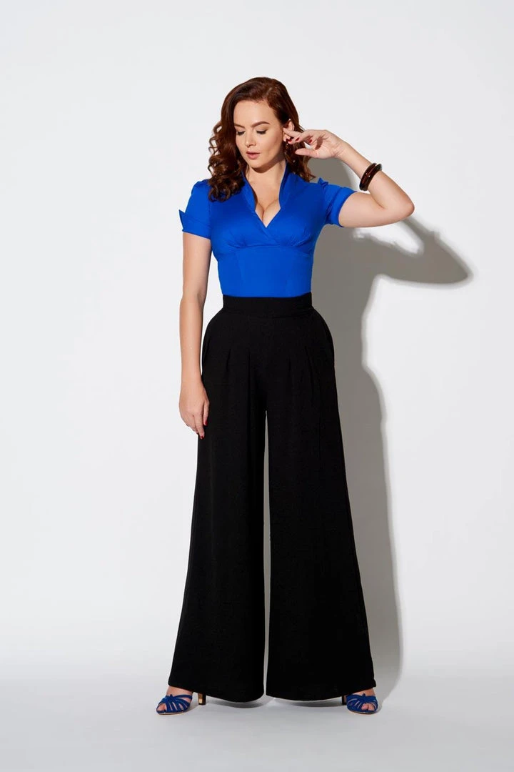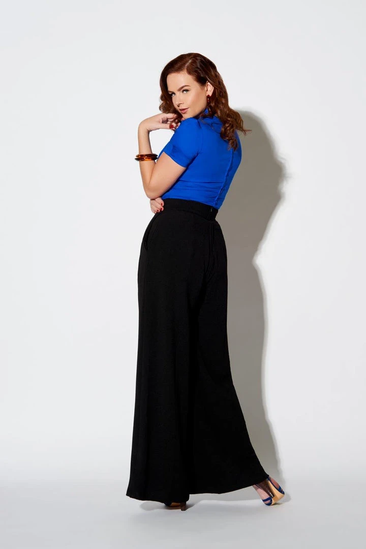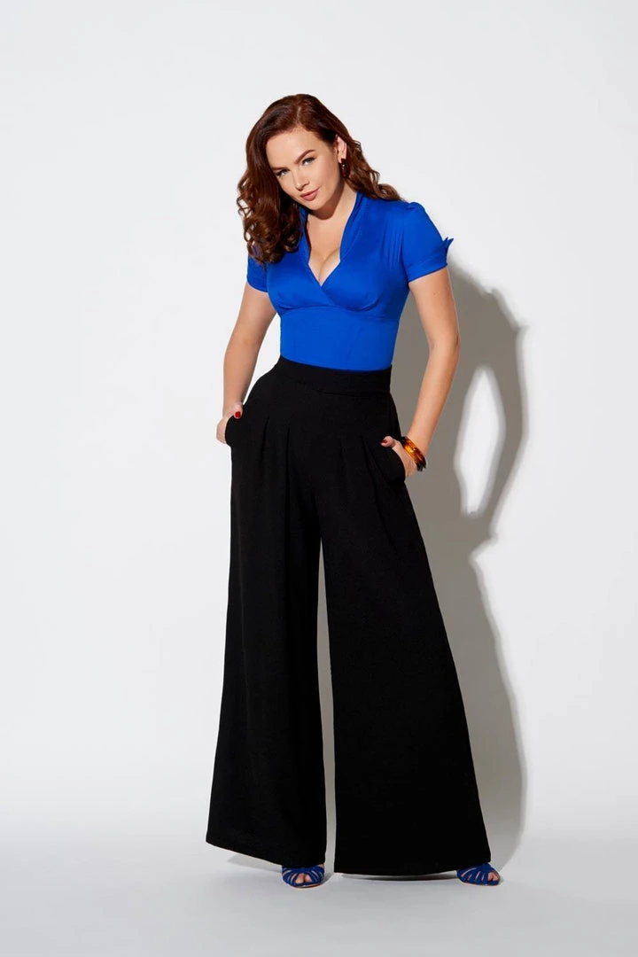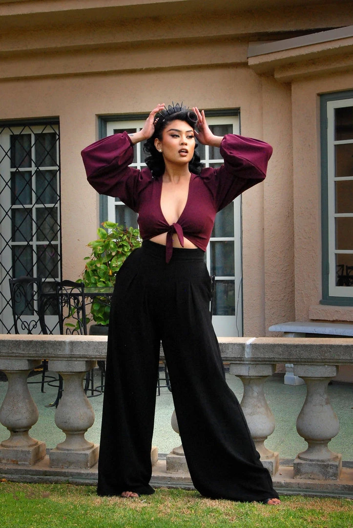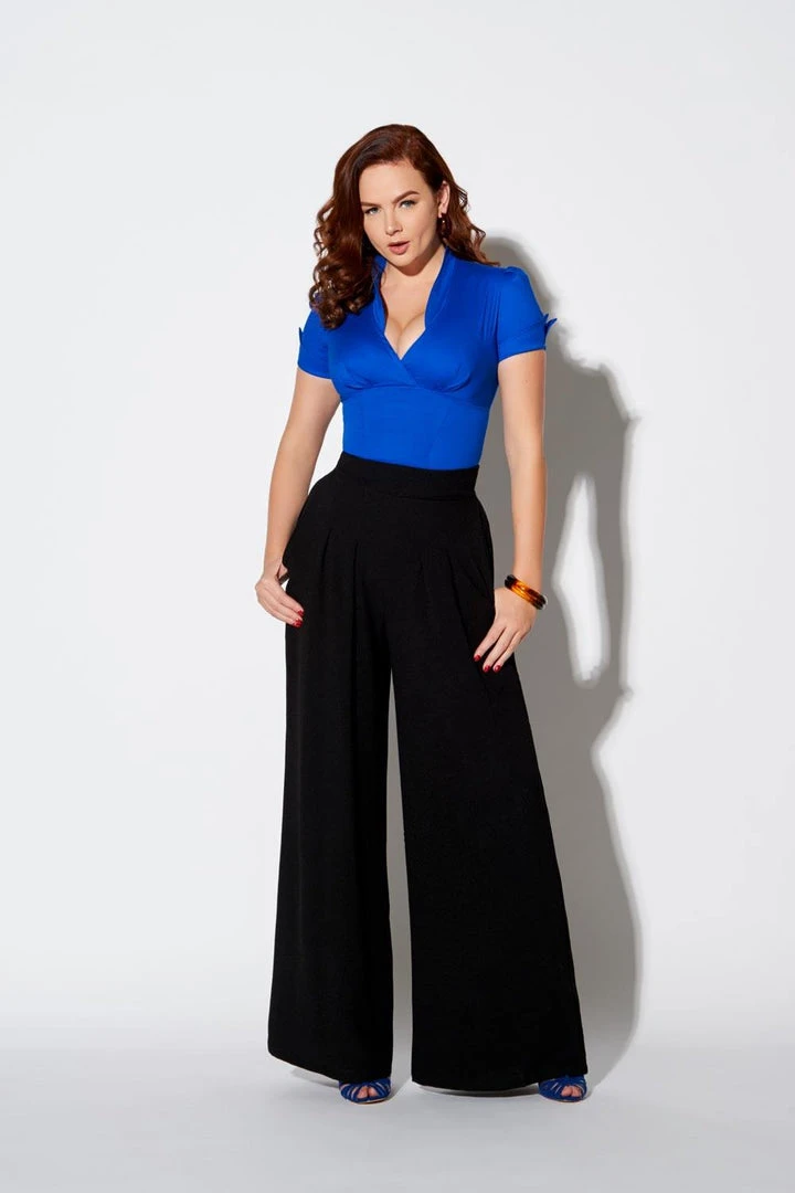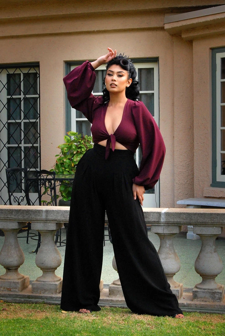 A customer favorite due to the beautiful fit and silhouette they provide, these wide leg pants are made from a high quality crepe that drapes down from tailored pleats. Thirty-four inches at their longest, certain colors are also available in 30 in. and 32 in. for pinups of all heights! The waistband has elastic in the back (on either side of the zipper) for the perfect fit. Sleek, sexy and sophisticated!