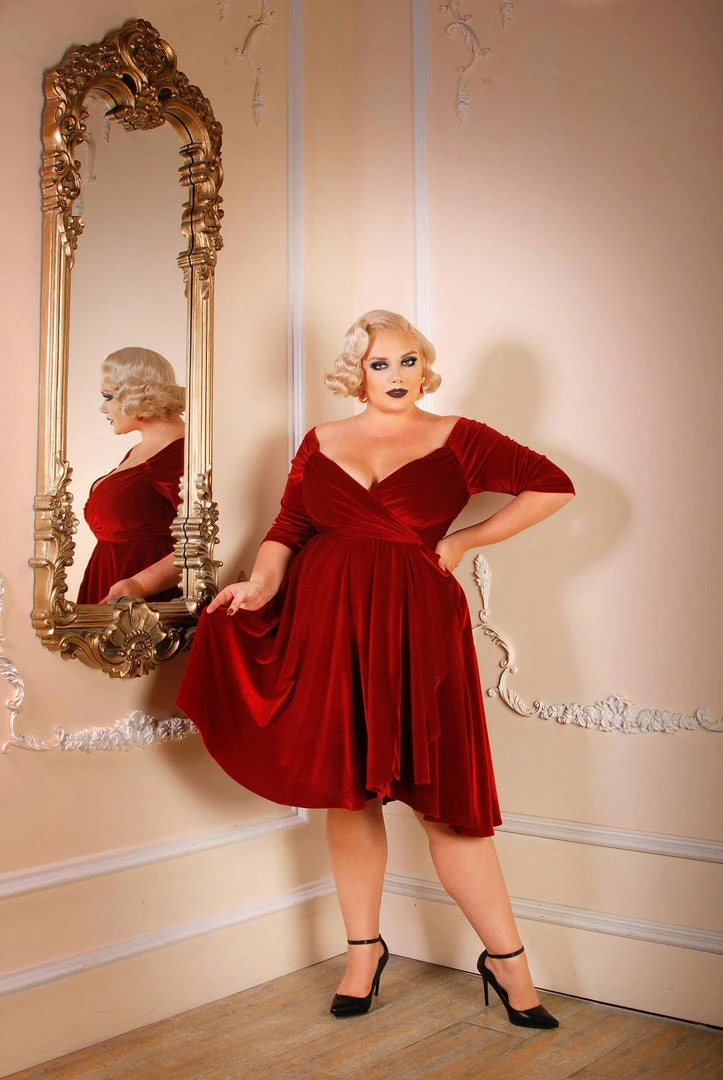 Inspired by our best-selling Monica wiggle, her sister is a swinging good time in the most sumptuous velvet you ever did see. The beautiful crossover bustline features soft, clear elastic that allows the sleeves to sit slightly off-shoulder for ultimate romance, but may also be worn comfortably on-shoulder. The Monica Swing includes our signature built-in stretch Bengaline shaper at the bust for support and structure while the gathered, faux wrap skirt flutters effortlessly. The result is a sweet but sexy swing dress that will have you turning heads all through the holidays.