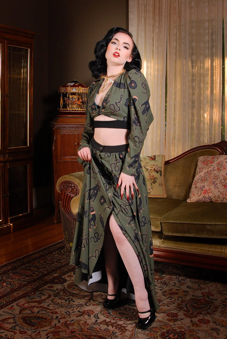 Created by designer Laura Byrnes and artist Hope Morrison, we present you the Selene Midi Skirt. This skirt is something truly magical, fully lined in a stretch crepe material, and featuring a buttoned front, a back elastic band, and pockets. Skirt is midi length, designed to sit at the lower calf for humans 5’10” and taller, and at the ankle for humans 5’7″ and shorter.
