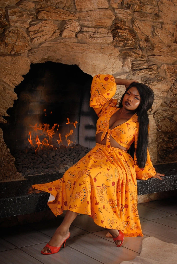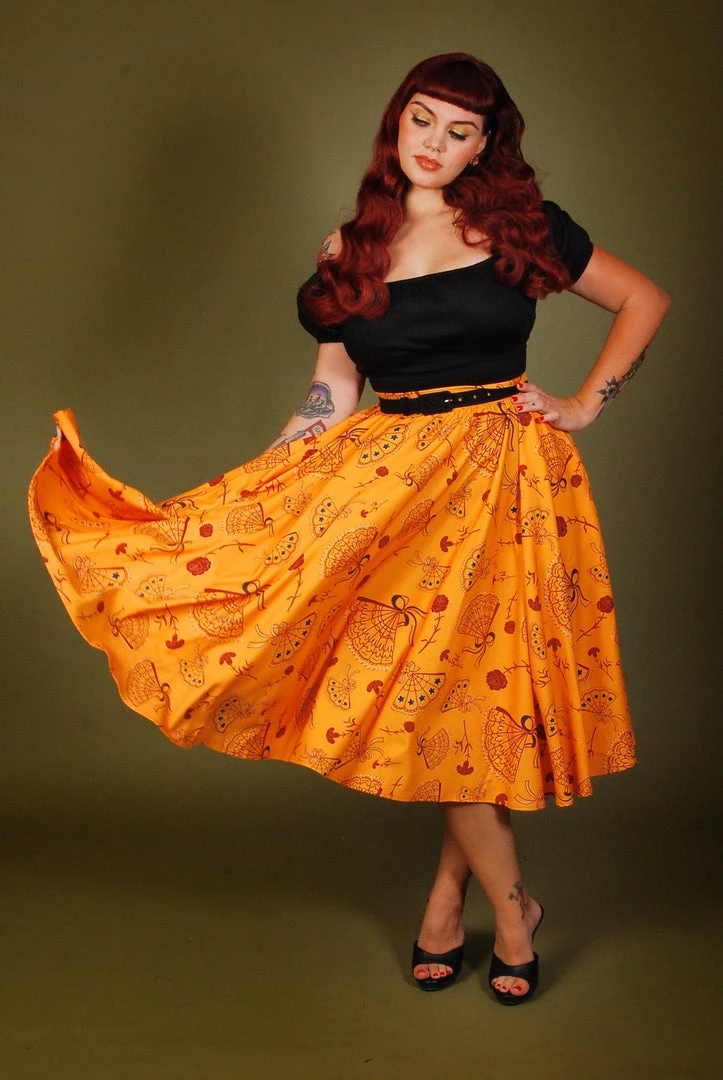 The Donna skirt is your new favorite staple. This gathered circle comes in our wrinkle defying poly crepe, with a back zip and pockets. Take Donna out for a swing on the dance floor, or on your next plane ride where you need to arrive looking fresh and lovely. Worn here with our matching Hayworth Tie Top and the Hot Girl Peep Toe Mules in Red Faux Leather. Complete the look with any one of our gorgeous La Donna Folding Fans in a variety of colors.