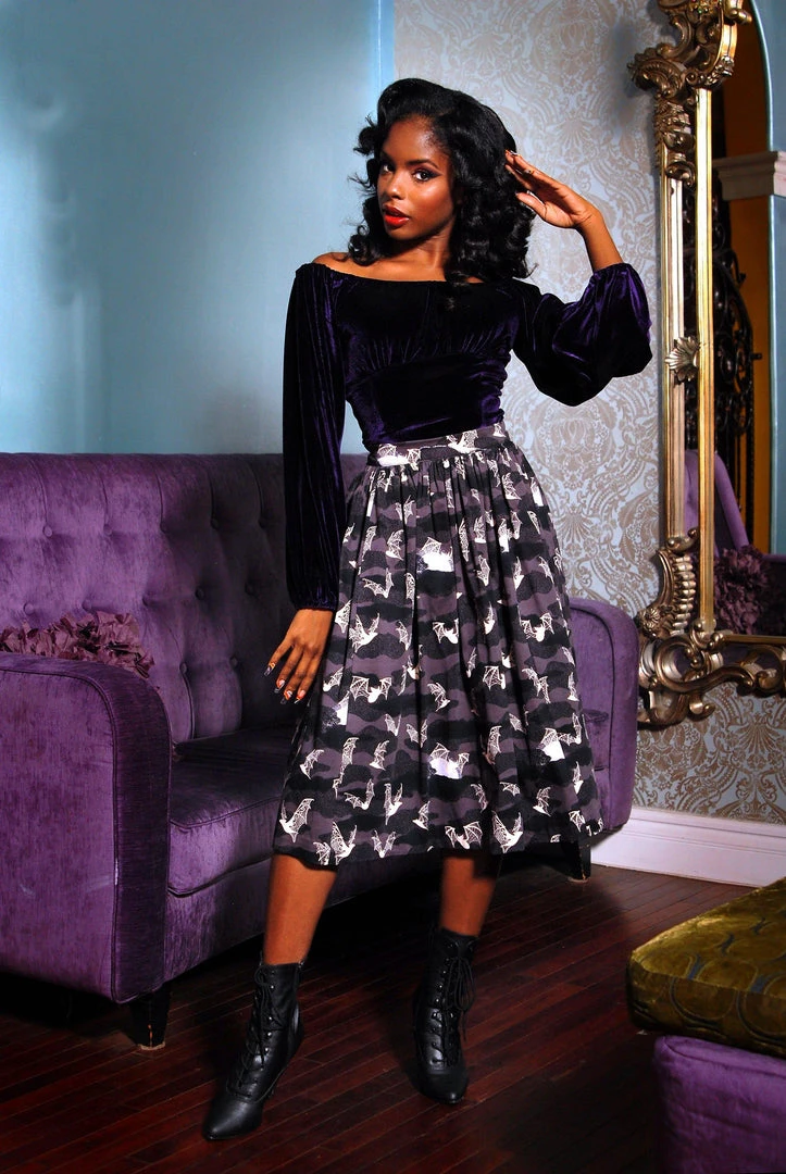 The cotton sateen Bella is your perfect vintage inspired gathered skirt, with a 2″ waistband and a sweep designed to beautifully showcase this classic silhouette. This skirt measures 26″ from waist seam to hem, and features deep pockets!