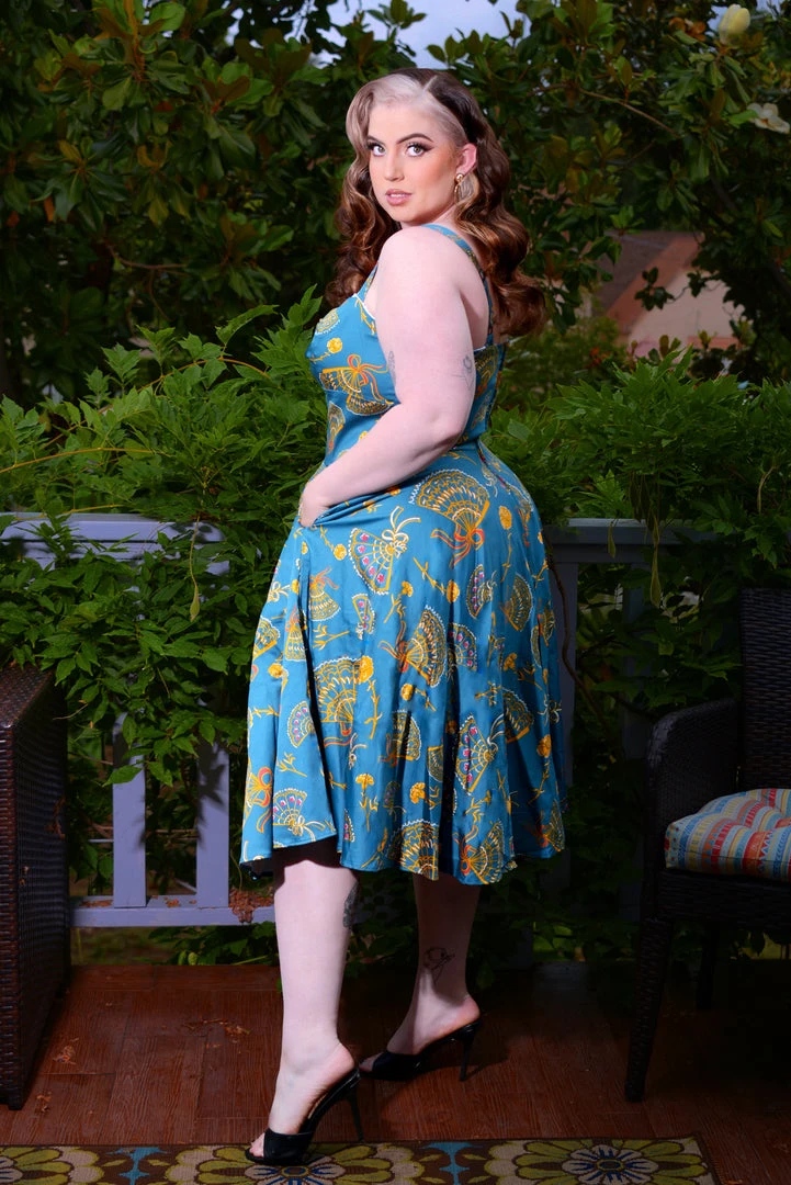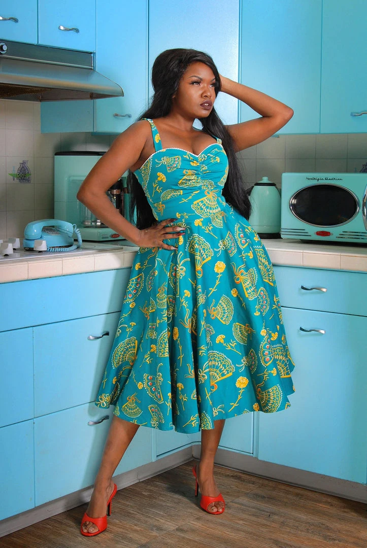 Simple and sweet, the Nancy makes its return in our exclusive Spanish Fans print by Hope Morrison. This dress features a sweetheart neckline accentuated by delicate white lace, full back zip, circle skirt, and pockets. Worn here with The Hot Girl Peep Toe Mule in Red Faux Leather, complete the look with any number of our La Donna Folding Fans in a variety of colors.
