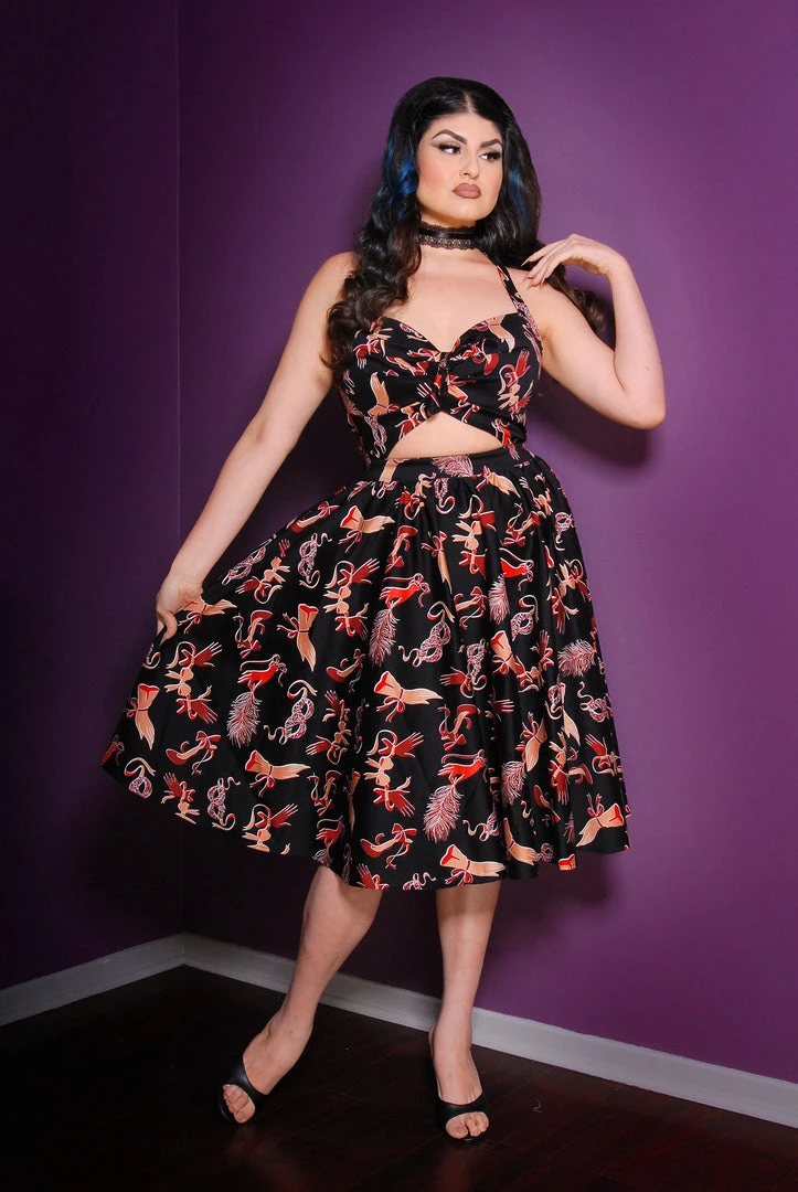 This gorgeous vintage inspired swing dress from LBHM features a gathered bodice that’s structured enough that in many cases, a bra is not needed. The Renee is an A-line silhouette in cotton sateen, with adjustable shoulder straps, a cute cutout at the center bodice, and of course, deep pockets we all know and love! Now in our exclusive Tie Me Up print by Hope Morrison featuring flirtatiously fetish-inspired art that is not for the faint of heart. Complete the look with our Midnight In Paris Lace Choker in Black (or the Bad Girl Faux Leather Buckle Choker for extra spice) and The Hot Girl Peep Toe Mules in Black Faux Leather.