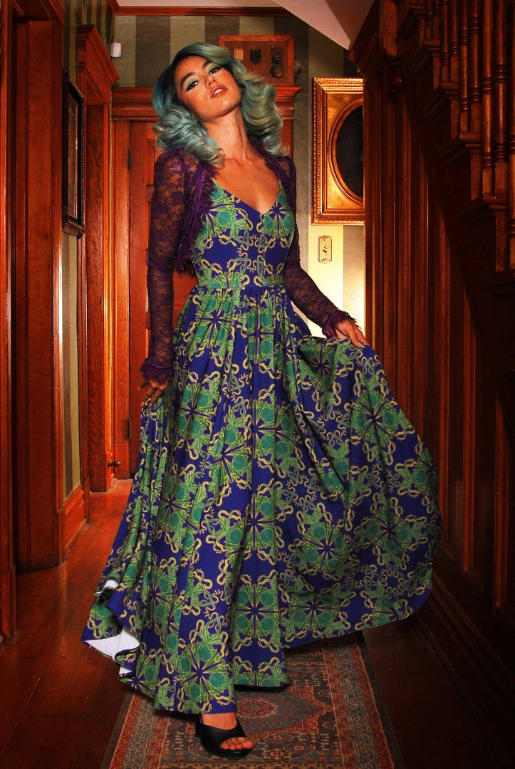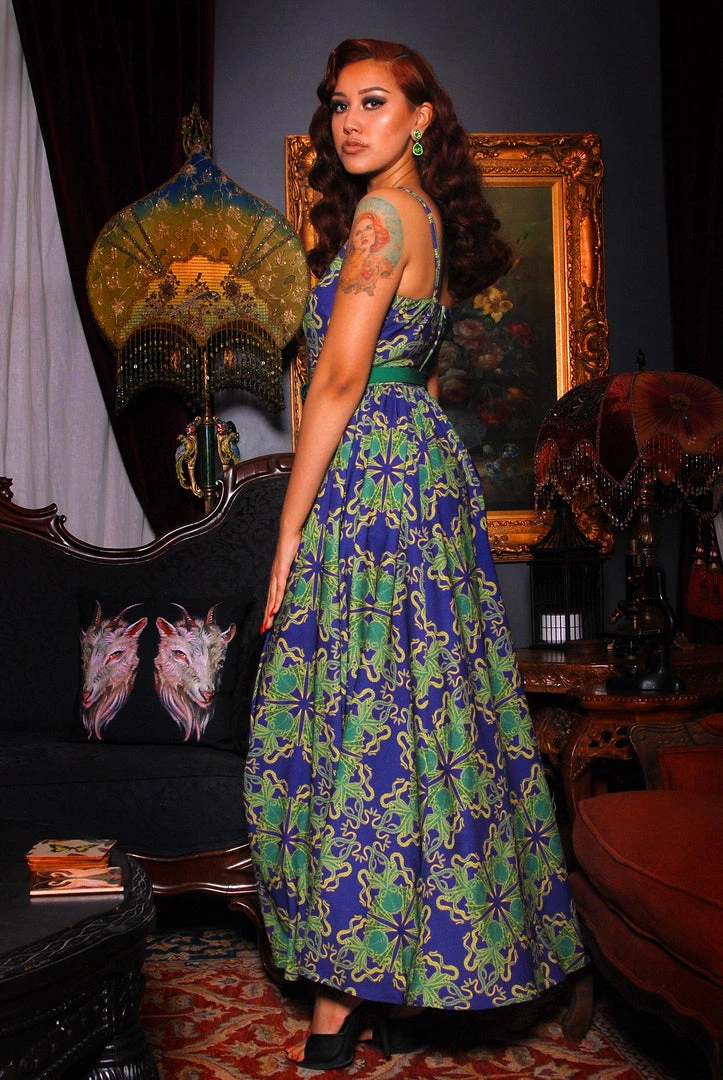 Now available in our exclusive Daddy Cthulhu print by Hope Johnstun. The Amalie Ballerina Daytime Maxi Gown features a 1970’s inspired, fitted “ballerina” style bodice, adjustable spaghetti straps, and a gathered maxi skirt with deep pockets. Fully lined, with a back zip. Perfect for summer with its flowy poly/spandex crepe material.