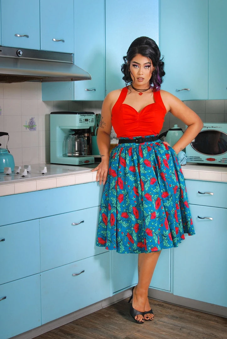 Our Gathered Circle Skirt is an enchanting combines the look of the beloved Pinup Couture classic Doris Skirt, but with a grander sweep, and a variation of the back zip waistband of the fan-favorite Little Jun Skirt, plus side seam pockets in our exclusive Poppies print by Hope Morrison. This beautiful cotton sateen skirt is inherently sophisticated and endlessly versatile, making it easy to mix and match with your Pinup Girl tops. This piece is made for romance, but fantastic for your work wear wardrobe, too. Complete the look with the Red Trixie Top, Loose Lips Faux Leather Double Strand Choker and the Hot Girl Peep Toe Mules in Black Faux Leather.