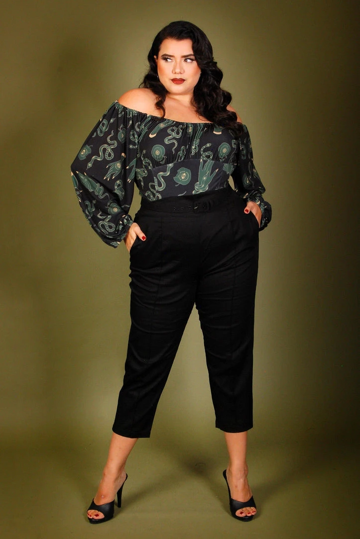 We took the flowing sleeves of our Gia Gown for added 1930’s inspired elegance and combined them with the curved bustline of our Peasant Tops to better accommodate bigger busts while also being super flattering on smaller chests. This top also features elasticized wrists, an elasticized neckline that can be easily worn on or off the shoulders, and no closures for a fuss-free pullover fit. Made from our classic stretch poly crepe, this top is made for all day comfort.