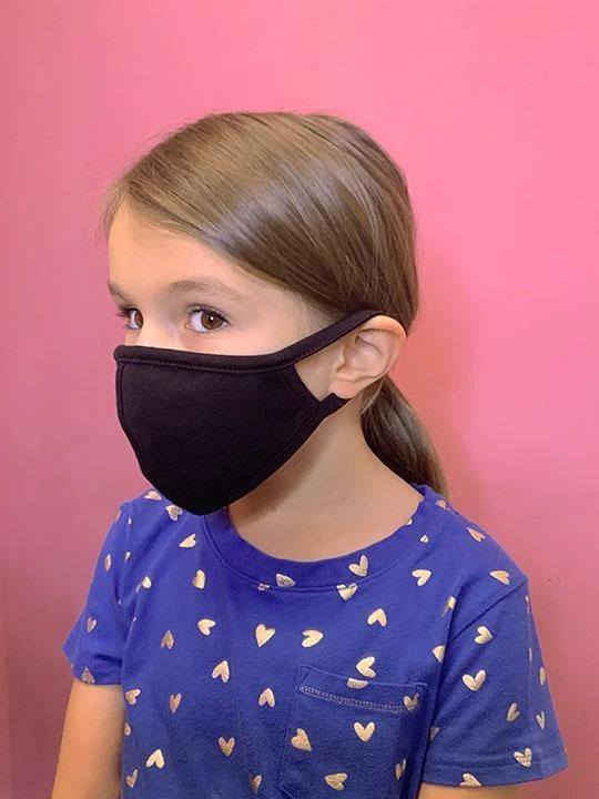 This solid black child sized fabric face mask is sized to best fit children over the age of 4 years, or a smaller older child and covers the top of the nose down to underneath the chin. Fabric is 95% cotton, 5% spandex cotton knit. Mask is made with an inside pocket to hold a filter. Mask can be worn over an n95 mask to extend its use. Change masks after 4 hours of wear. Machine wash cold and dry low before use. Designed and sewn in Los Angeles, CA.