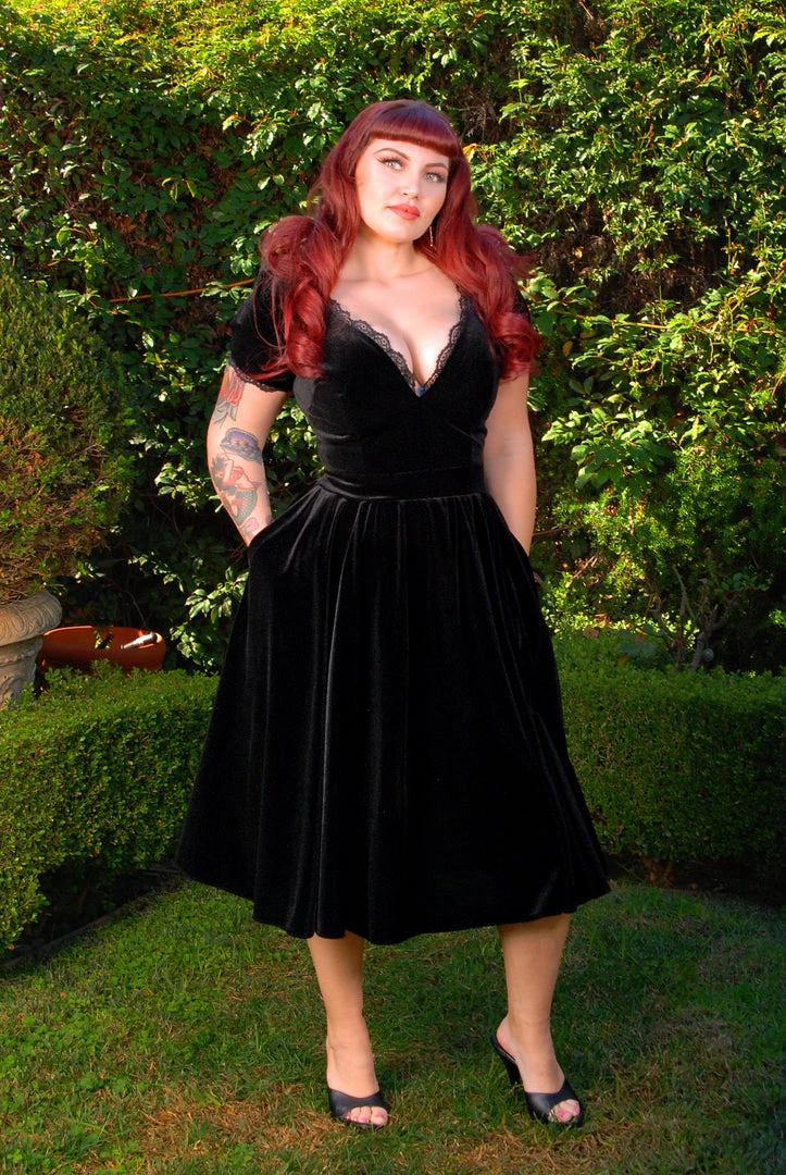 Inspired by our classic Lilith Top, the Lilith Swing Dress is made from soft and stretchy velvet, with flirty eyelash lace detail along the bust and sleeves. The bodice is seamed to perfectly flatter your curves, while the full skirt offers comfort (and pockets). Belt not included.