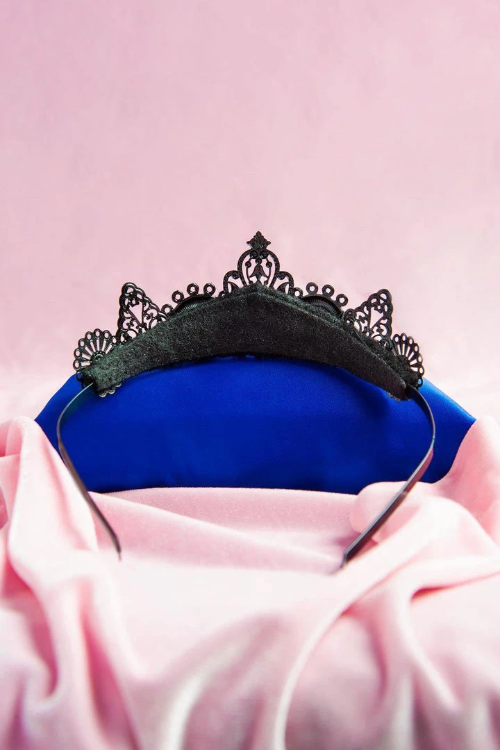 A noble tiara for a noble goddess. Brass filigree stampings are hand-sewn to a crown base and painted rich black. The stampings extend 2 inches from the headband base while still remaining comfortable and lightweight. One size fits all, bobby pins can easily be used for added securing. Wear everyday or any occasion that you need to pop a crown on your head.