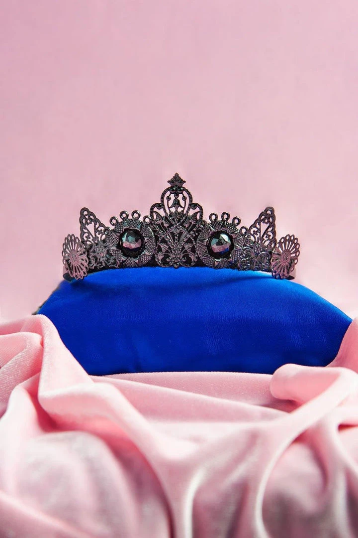 A noble tiara for a noble goddess. Brass filigree stampings are hand-sewn to a crown base and painted rich black. The stampings extend 2 inches from the headband base while still remaining comfortable and lightweight. One size fits all, bobby pins can easily be used for added securing. Wear everyday or any occasion that you need to pop a crown on your head.