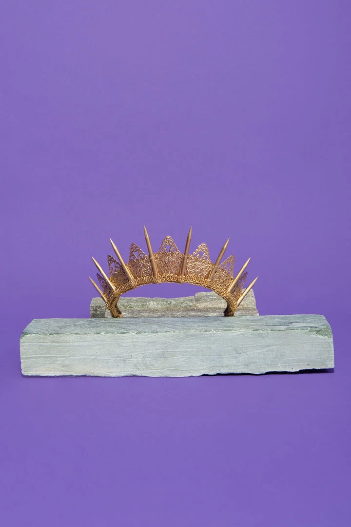 Unrestrained beauty is exhibited in the Libertine Crown. Brass filigree stampings are hand-sewn to the crown base and painted a brilliant gold. Measuring approximately 2 inches from headband base, the crown still remains comfortable and lightweight. One size fits all – bobby pins can easily be used for added security. Wear everyday or any occasion that you need to pop a crown on your head!