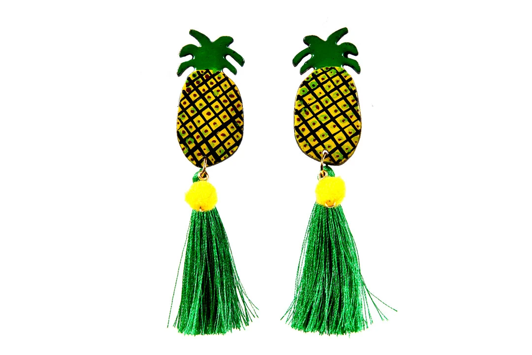 Nuez Moscada – Colombia Final Sale – Hand Made Tropical Pineapple Earrings With Green Tassel Shop All In-Stock Items By Size