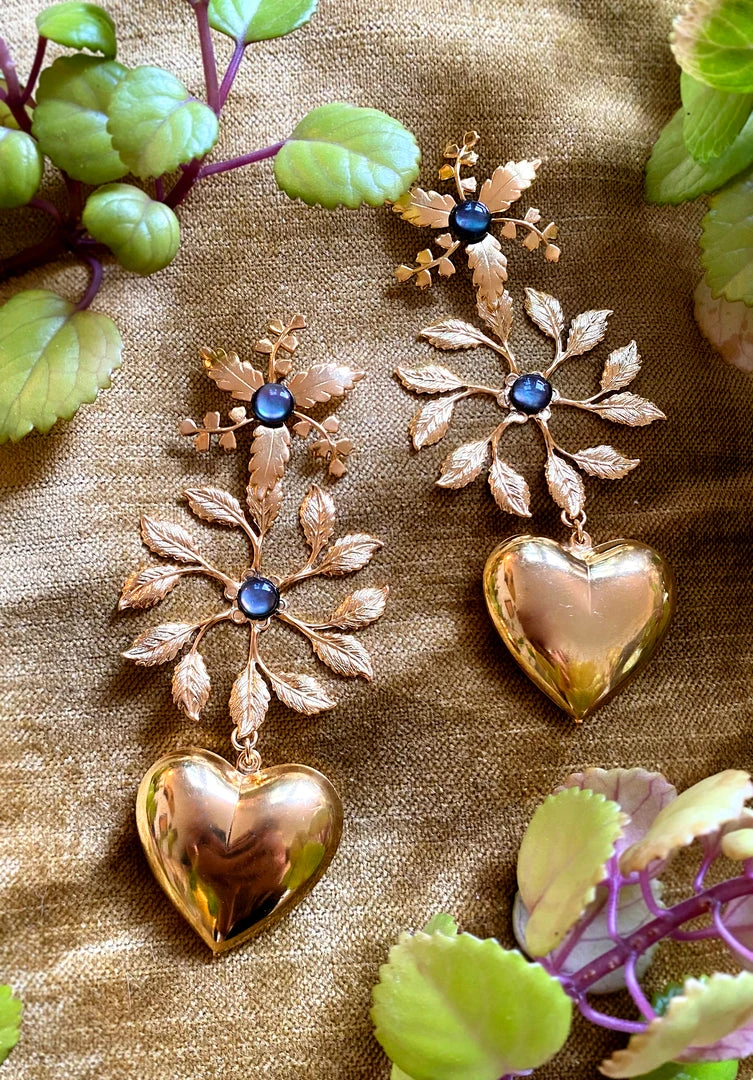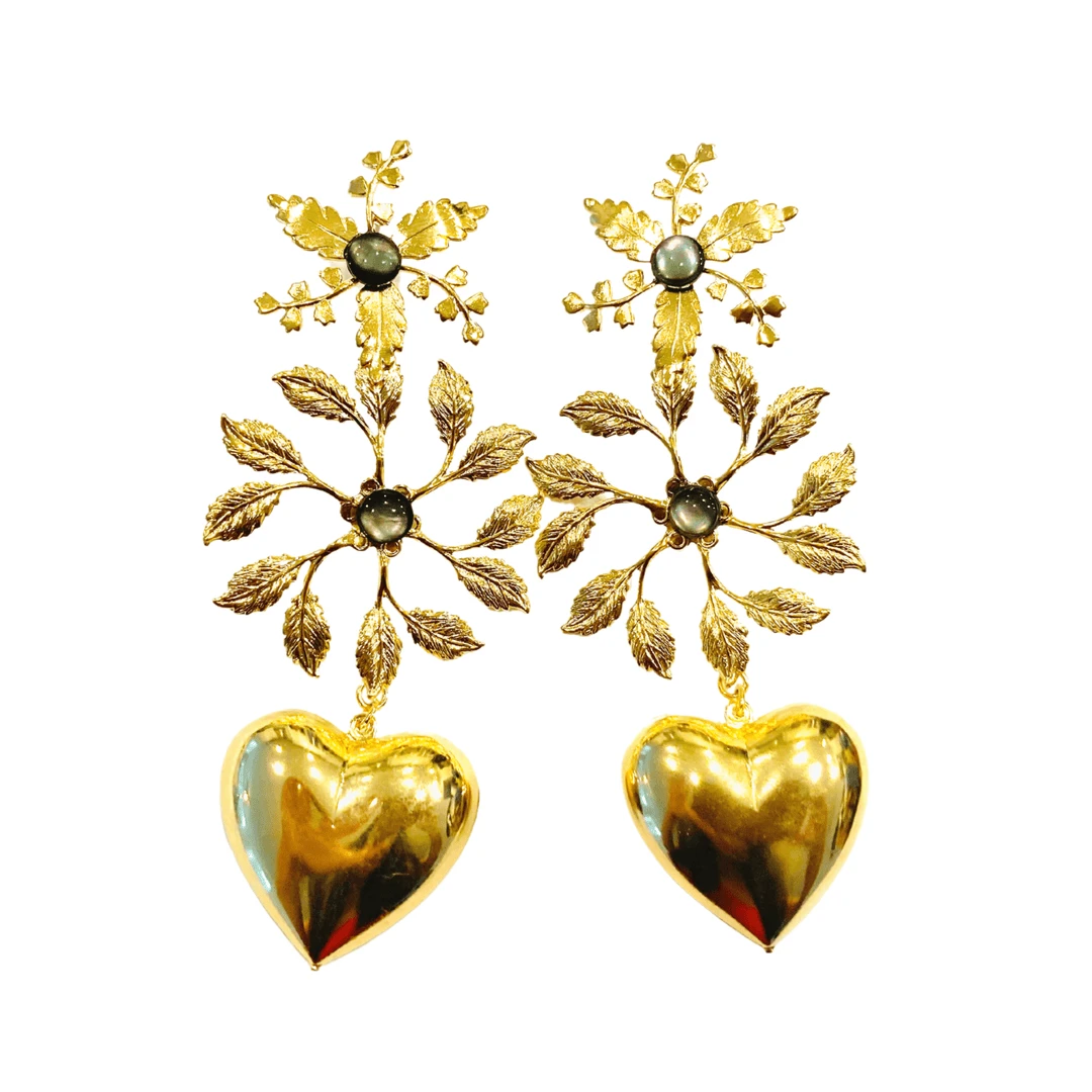 Surgical steel post. A truly dramatic and show stopping earring that measures 4 inches long. Gorgeous florals connect with a puff heart and is dotted with pearls. A large, handmade piece without the weight, 18k gold plated and nickel-free.