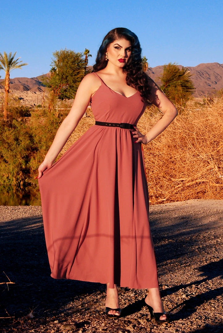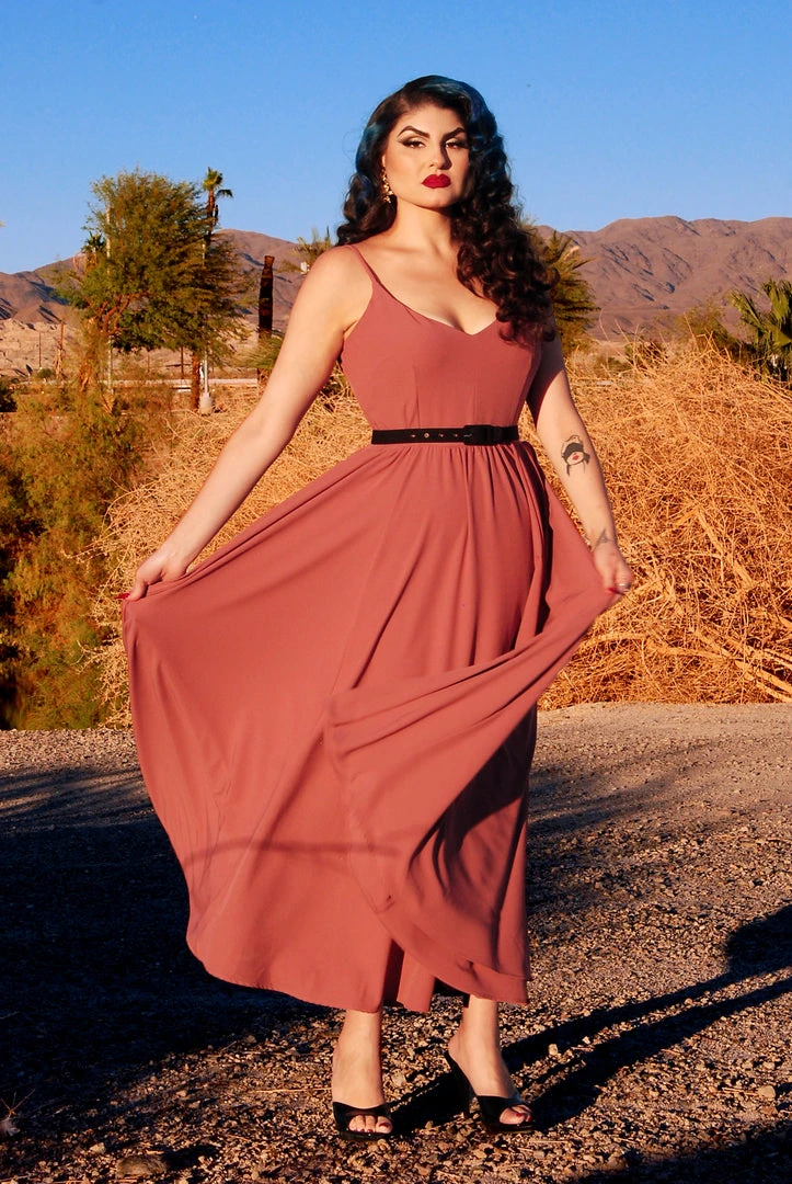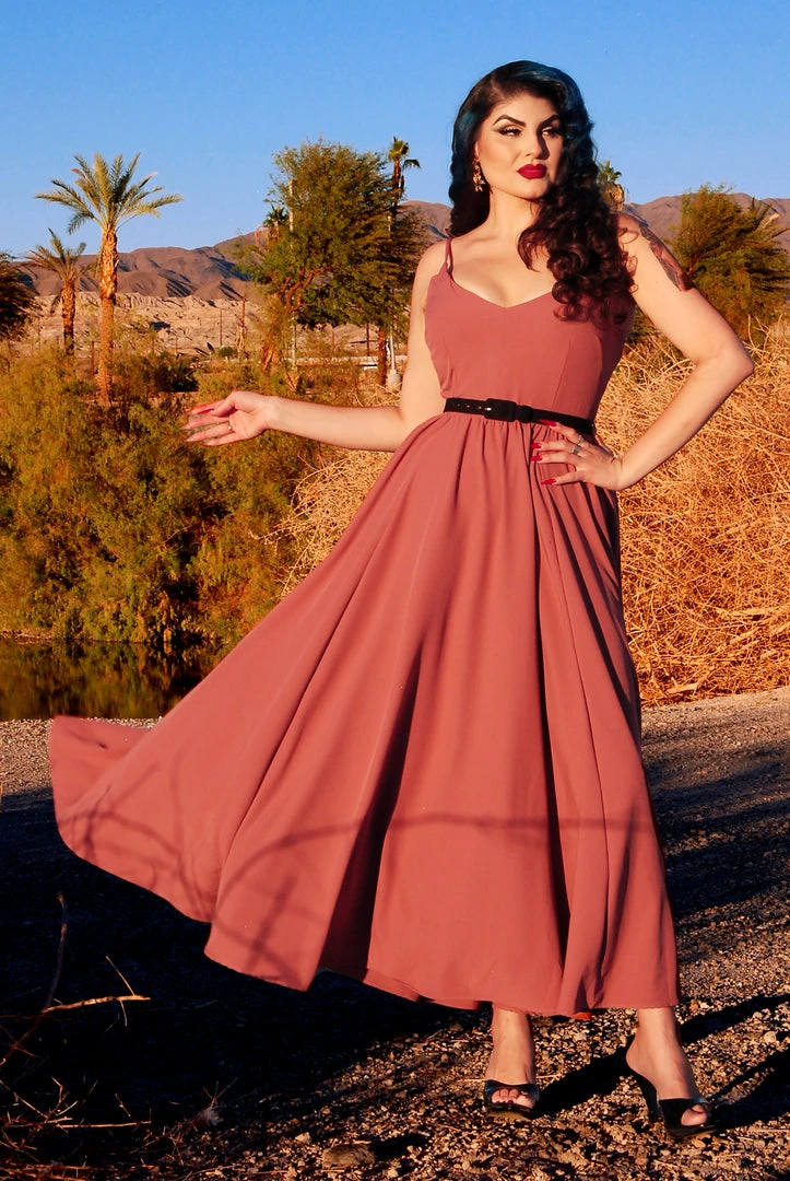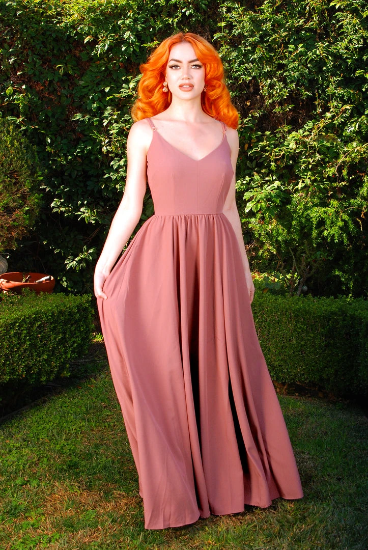 Featuring a 70’s inspired, fitted “ballerina” style bodice, adjustable spaghetti straps, and a gathered maxi skirt with deep pockets. Fully lined, with a back zip. Perfect for summer with its flowy poly/spandex crepe material.