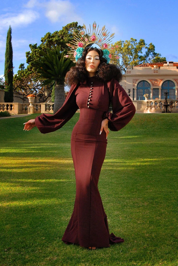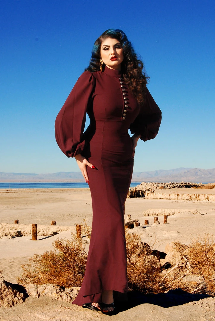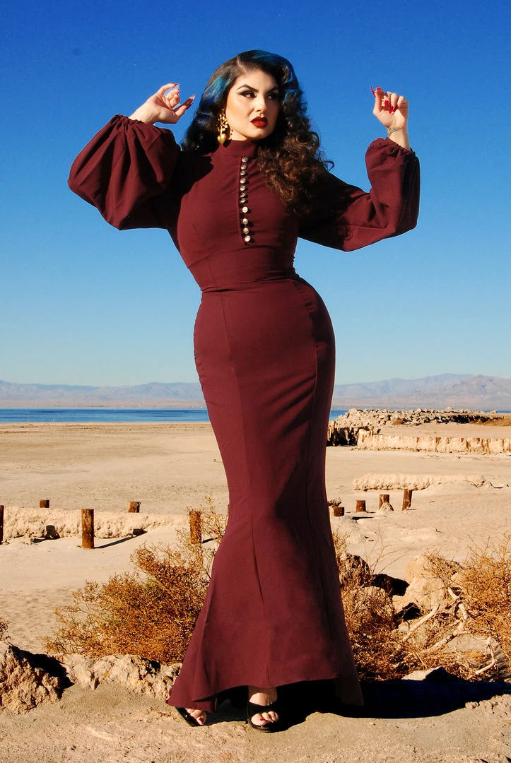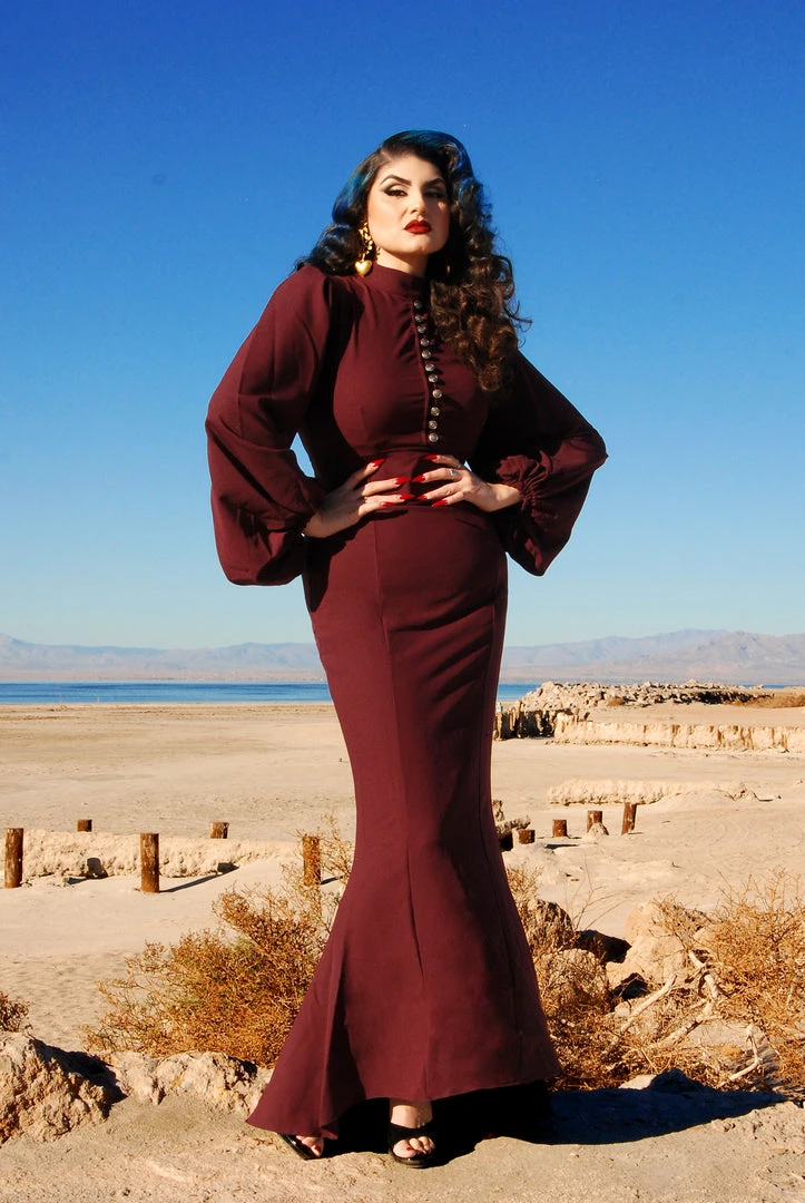 Slip into something a little wicked with the Serafina maxi gown. Featuring a row of buttons that accent a high collar, dramatic bishop sleeves to ensure all eyes stay on you, and a slight fishtail train to ensure your rear view is just as memorable as your entrance.