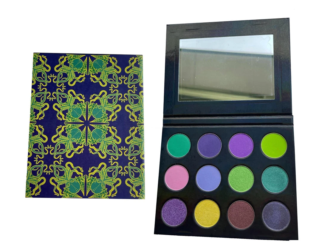 All vegan and cruelty free, our Daddy Cthulhu palette contains 12 distinct shades to set off your eyes in the most bewitching way. Contains cosmetic safe talc, made in the USA.
