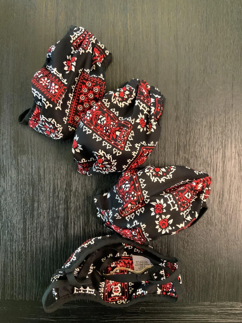 Style #1 – has elastic all around mask. This set of four fabric masks measure 7 1/2″ x 3 1/2″ flat, and when worn will open to 7 1/2″ x 6″ and covers the top of the nose down to underneath the chin. Fabric is 97% cotton, 3% spandex cotton sateen. Mask is made with an inside pocket to hold a filter. Mask can be worn over an n95 mask to extend its use. Change masks after 4 hours of wear. Machine wash cold and dry low before use.