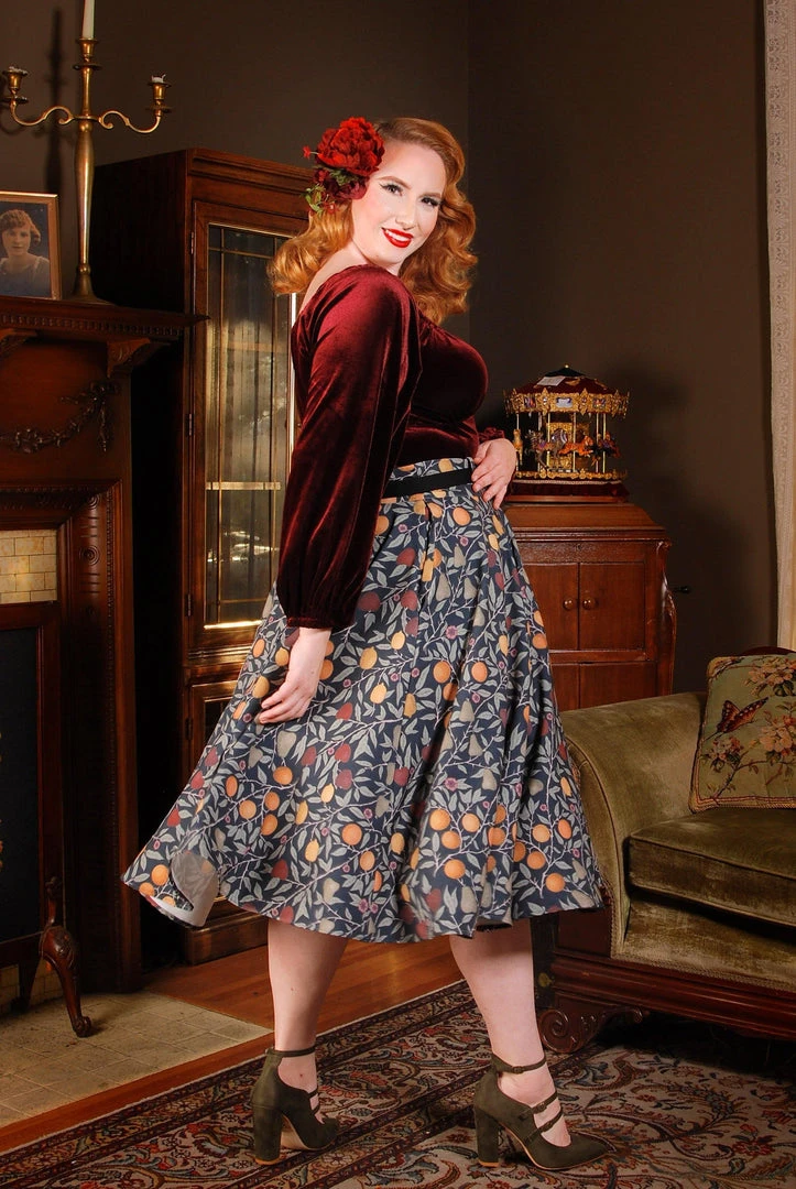 We took the flowing sleeves of our Gia Gown for added 1930’s inspired elegance and combined them with the curved bustline of our Peasant Tops to better accommodate bigger busts while also being super flattering on smaller chests. This top also features elasticized wrists, an elasticized neckline that can be easily worn on or off the shoulders, and no closures for a fuss-free pullover fit. Finally we topped it all off in sexy stretch velvet. Mixes and matches beautifully with a number of our skirts styles, including our Donna Vintage Circle Skirt in Mustard Spanish Fans. Don’t forget a pair of the Samantha 3-Strap Pumps in Olive for your pins and Burgundy and Plum Peonies and Roses for your hair.