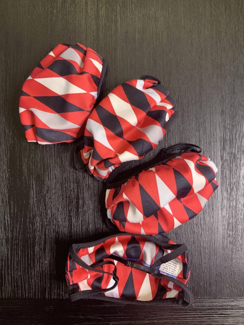 Style #1 – has elastic all around mask. This set of four fabric masks measure 7 1/2″ x 3 1/2″ flat, and when worn will open to 7 1/2″ x 6″ and covers the top of the nose down to underneath the chin. Fabric is 97% cotton, 3% spandex cotton sateen. Mask is made with an inside pocket to hold a filter. Mask can be worn over an n95 mask to extend its use. Change masks after 4 hours of wear. Machine wash cold and dry low before use.