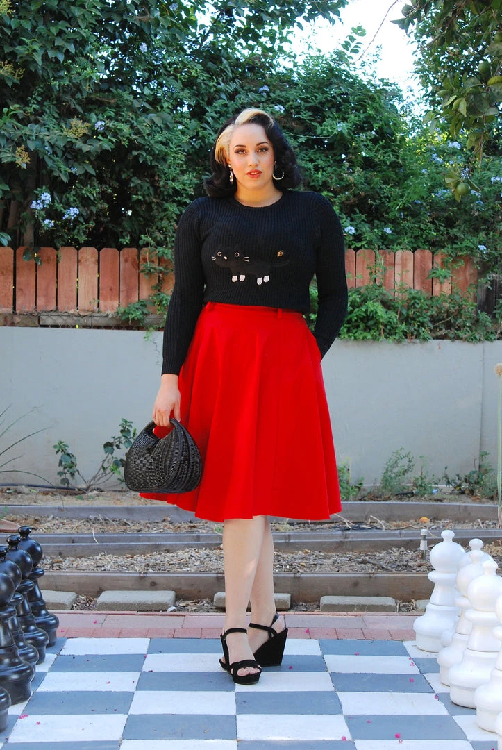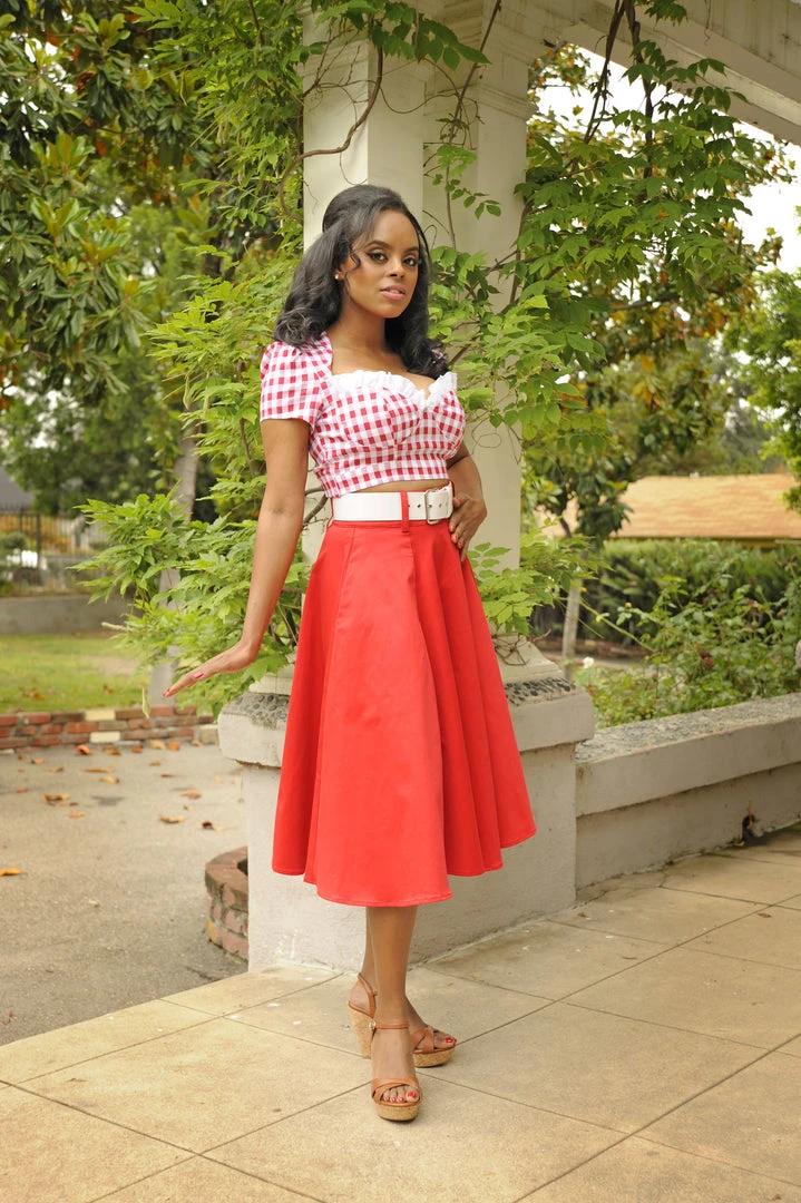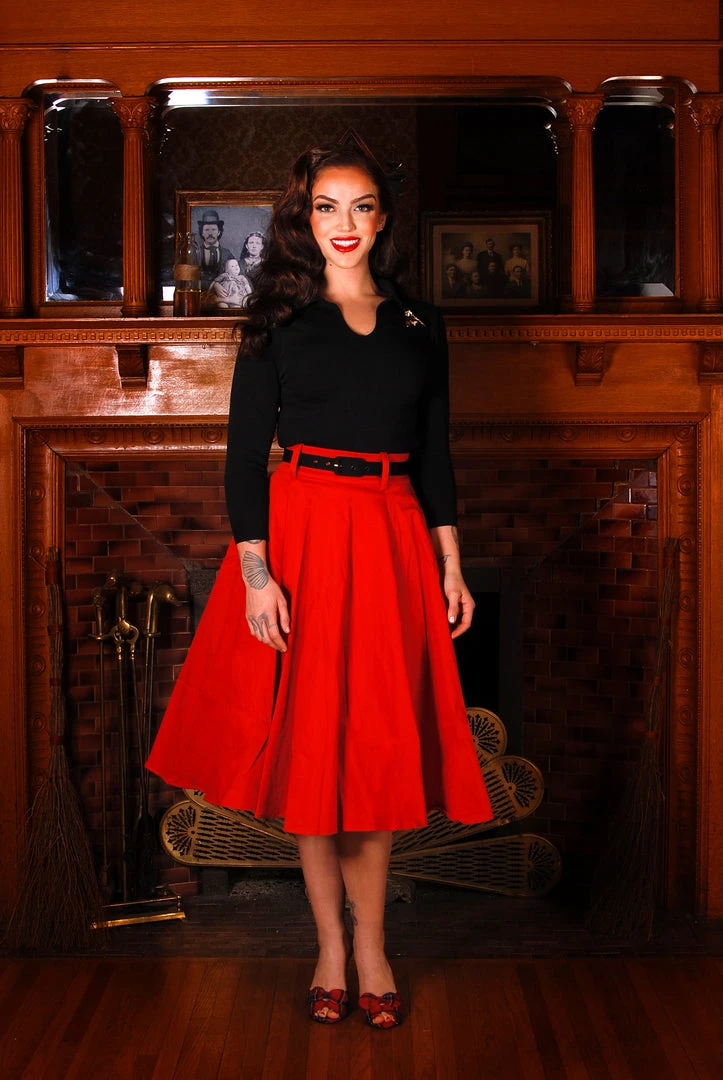 The Doris skirt is a elegant swing skirt with a full sweep and no gathers or pleats. However, it’s the 21st century, so this skirt has deep pockets. Designed as a callback to the true circle skirts of the 1950’s, It has a nipped in waistband, a back zipper, deep pockets, and loops for a wide belt. Made from the highest quality, heavyweight cotton sateen. If you’re looking for that added oomph under, we suggest our Twill Underskirt. Shown with the Myrna Top in Red Gingham, coming soon.