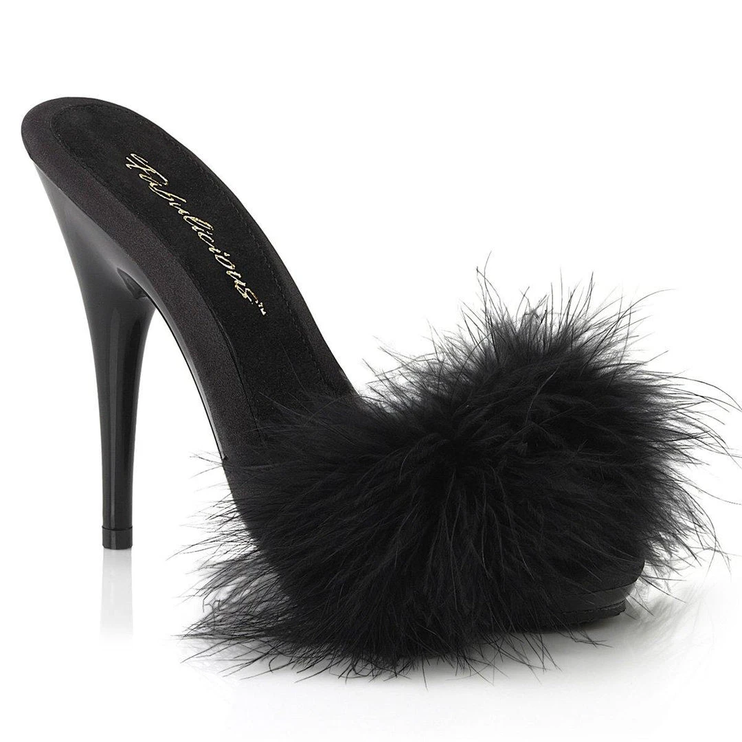 Set out to scandalize in these 5″ heel marabou mules in classic black.