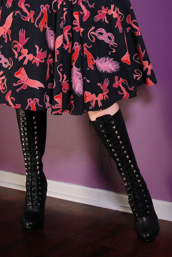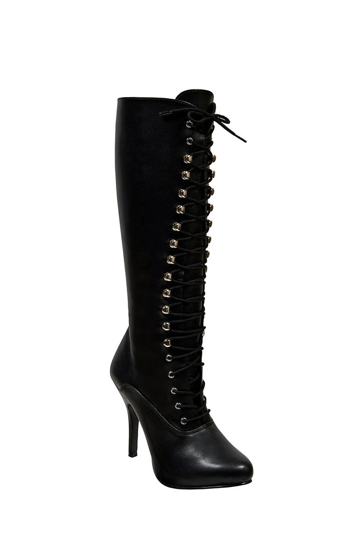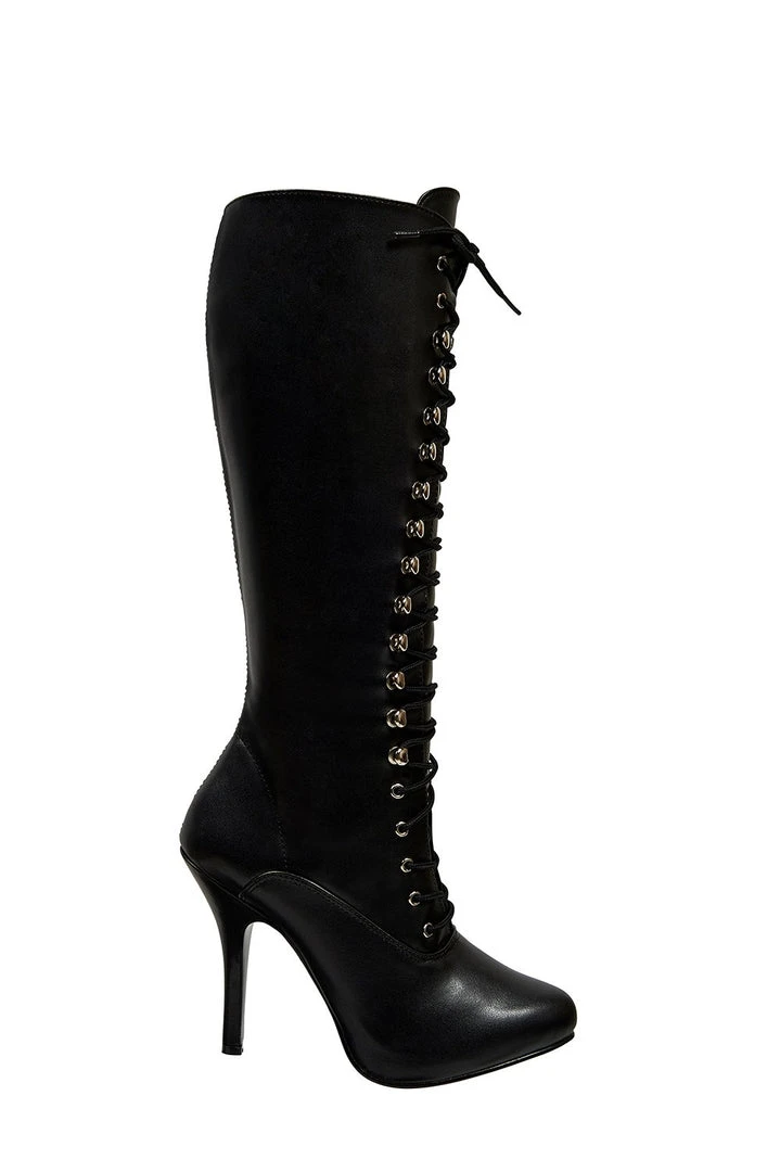 Being bad never looked so good. These sexy knee-high boots are made of patent vegan leather with a 4.5″ stiletto heel and pointed toe, while its hidden platform and high heel get serious about the business of seduction. Features an inner zip, so you’ll only have to lace these once. Shaft Height: Approx. 14” Tall. Heel Height: Approx. 4 1/2” Tall. Fits true to size.