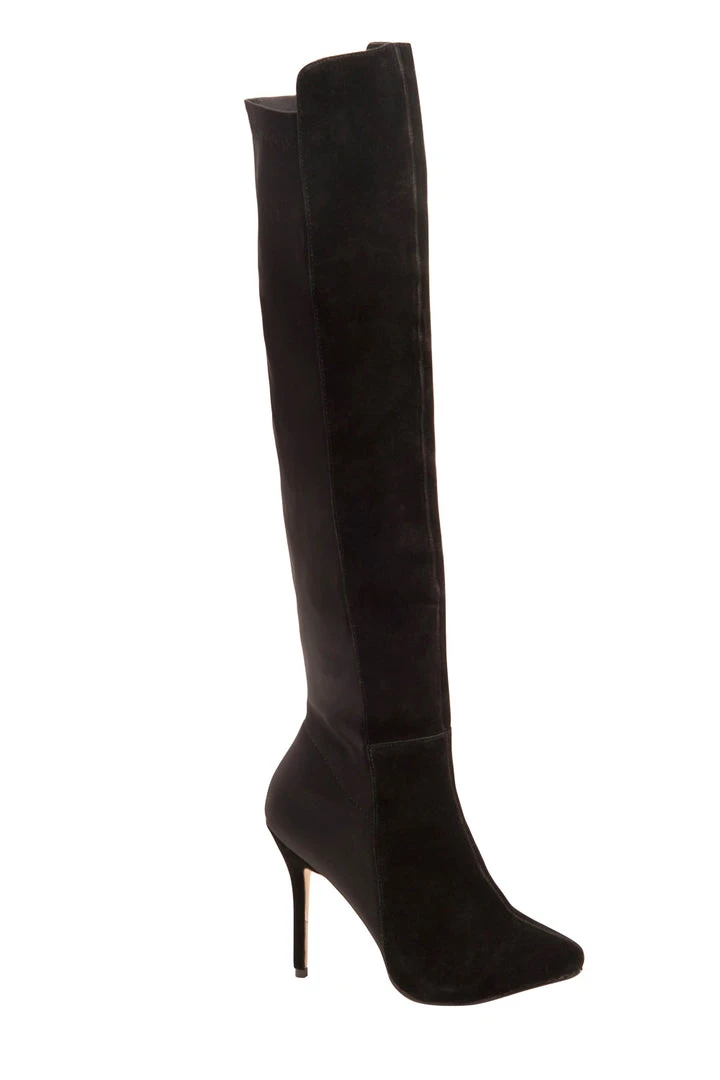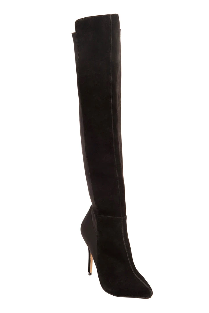 Slip into the Ultra Vixen faux suede stiletto boots and you’ll command attention the second you walk into the room!.This over-the-knee sky-high pair of boots has a black faux suede front, stretch back panel and inner side zipper. These true-to-size boots flaunt 5-inch heels, paired with a 3/8-inch hidden platform, give your looks some major height and will give all your Pinup Girl outfits the type of presentation that is sure to get the recognition you deserve.