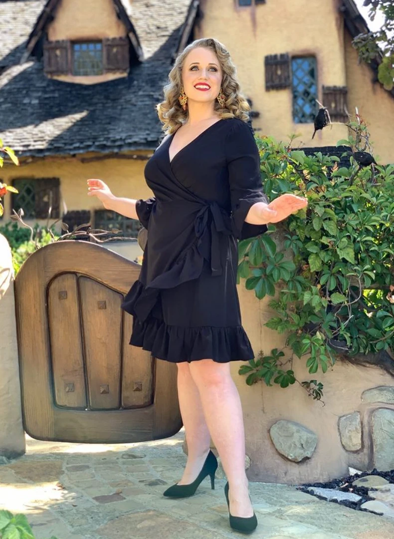 Take this slinky little ruffled wrap dress out on the town for a dance.